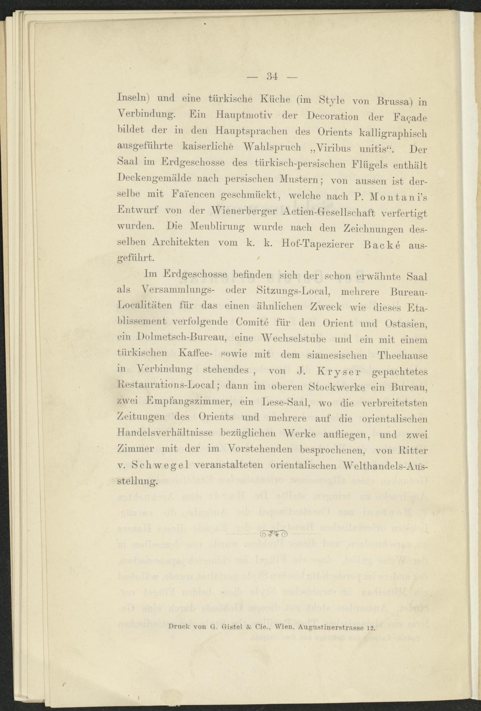 Inseln) und eine türkische Küche (im Style von Brussa) in Verbindung. Ein Hauptmotiv der Décoration der Façade bildet der in den Hauptsprachen des Orients kalligraphisch ausgeführte kaiserliche Wahlspruch „Viribus unitis“. Der Saal im Erdgeschosse des türkisch-persischen Flügels enthält Deckengemälde nach persischen Mustern ; von aussen ist derselbe mit Faïencen geschmückt, welche nach P. Montani’s Entwurf von der Wienerberger Actien-G-esellscliaft verfertigt wurden. Die Meublirung wurde nach den Zeichnungen desselben Architekten vom k. k. Hof-Tapezierer Backé ausgeführt. '