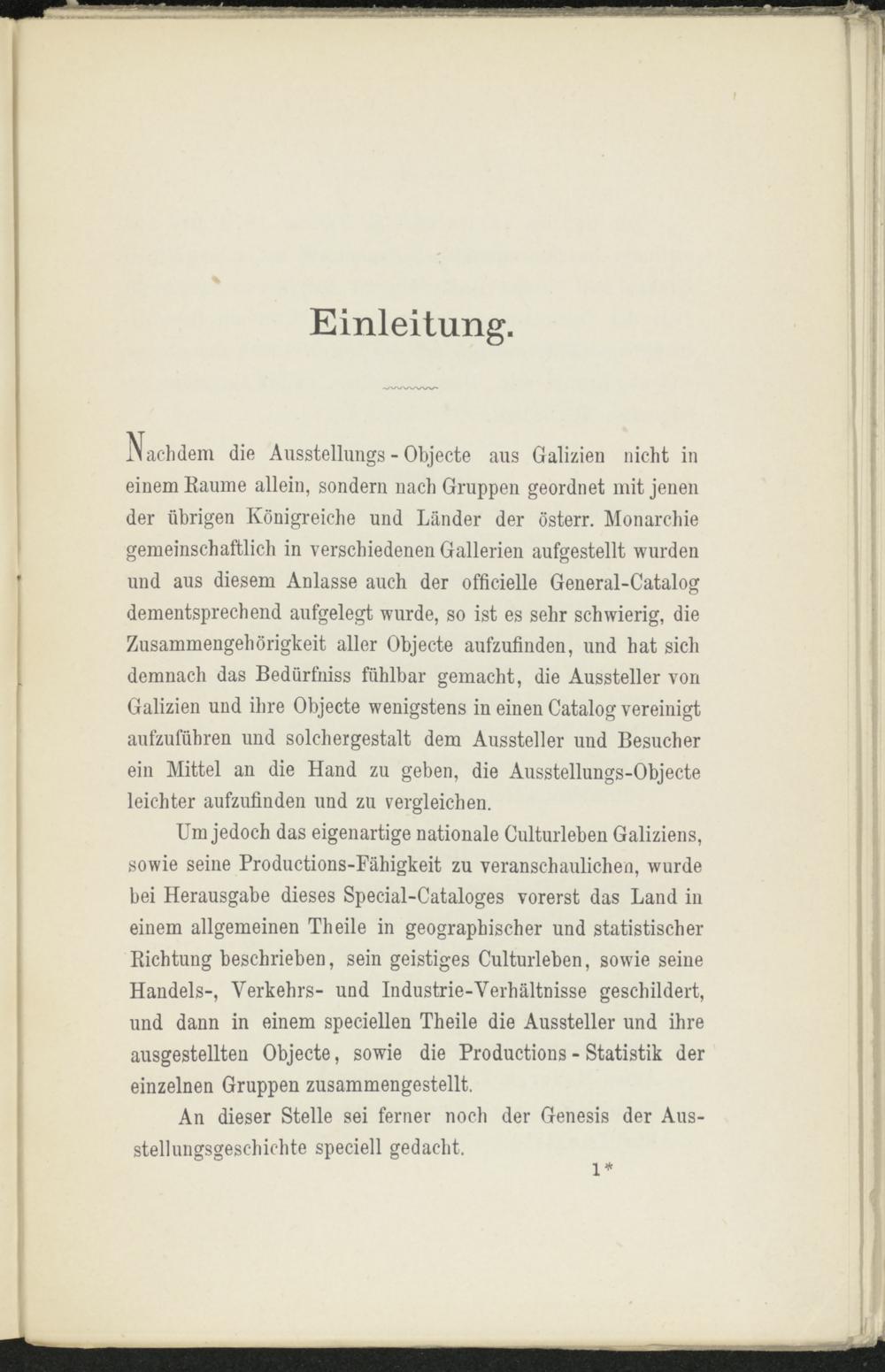 Um jedoch das eigenartige nationale Culturleben Galiziens, sowie seine Productions-Fähigkeit zu veranschaulichen, wurde bei Herausgabe dieses Special-Cataloges vorerst das Land in einem allgemeinen Th eile in geographischer und statistischer Richtung beschrieben, sein geistiges Culturleben, sowie seine Handels-, Verkehrs- und Industrie-Verhältnisse geschildert, und dann in einem speciellen Theile die Aussteller und ihre ausgestellten Objecte, sowie die Productions - Statistik der einzelnen Gruppen zusammengestellt.