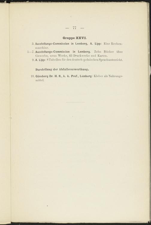 —7. Ausstellungs-Commission in Lemberg. Zehn Bücher über Gewerbe, neun Werke, 43 Druckwerke und Karten.