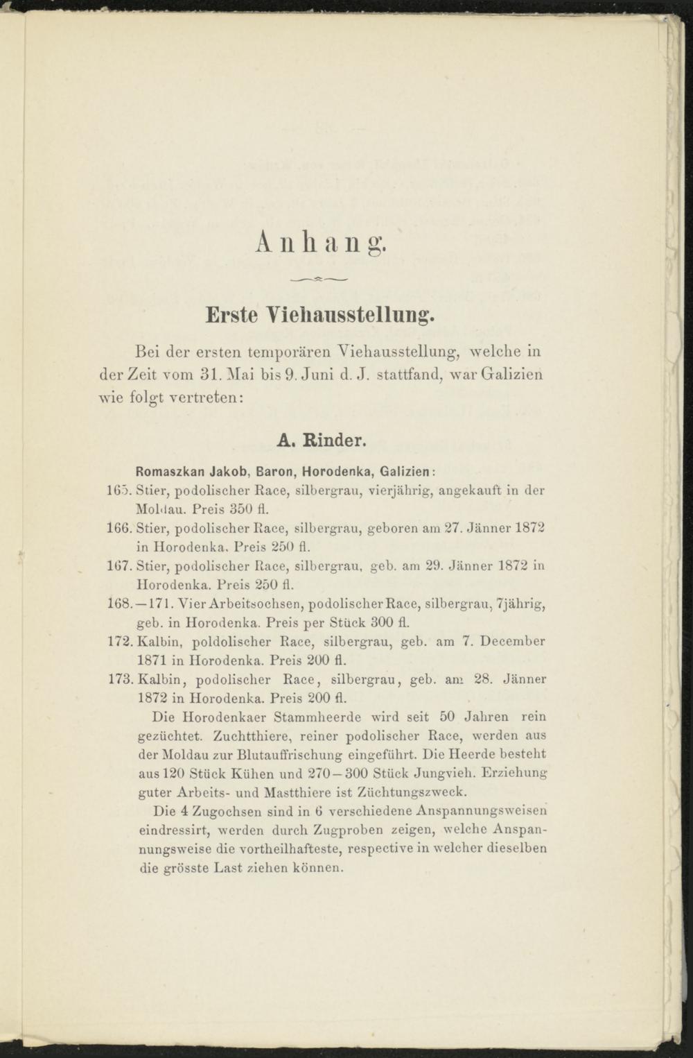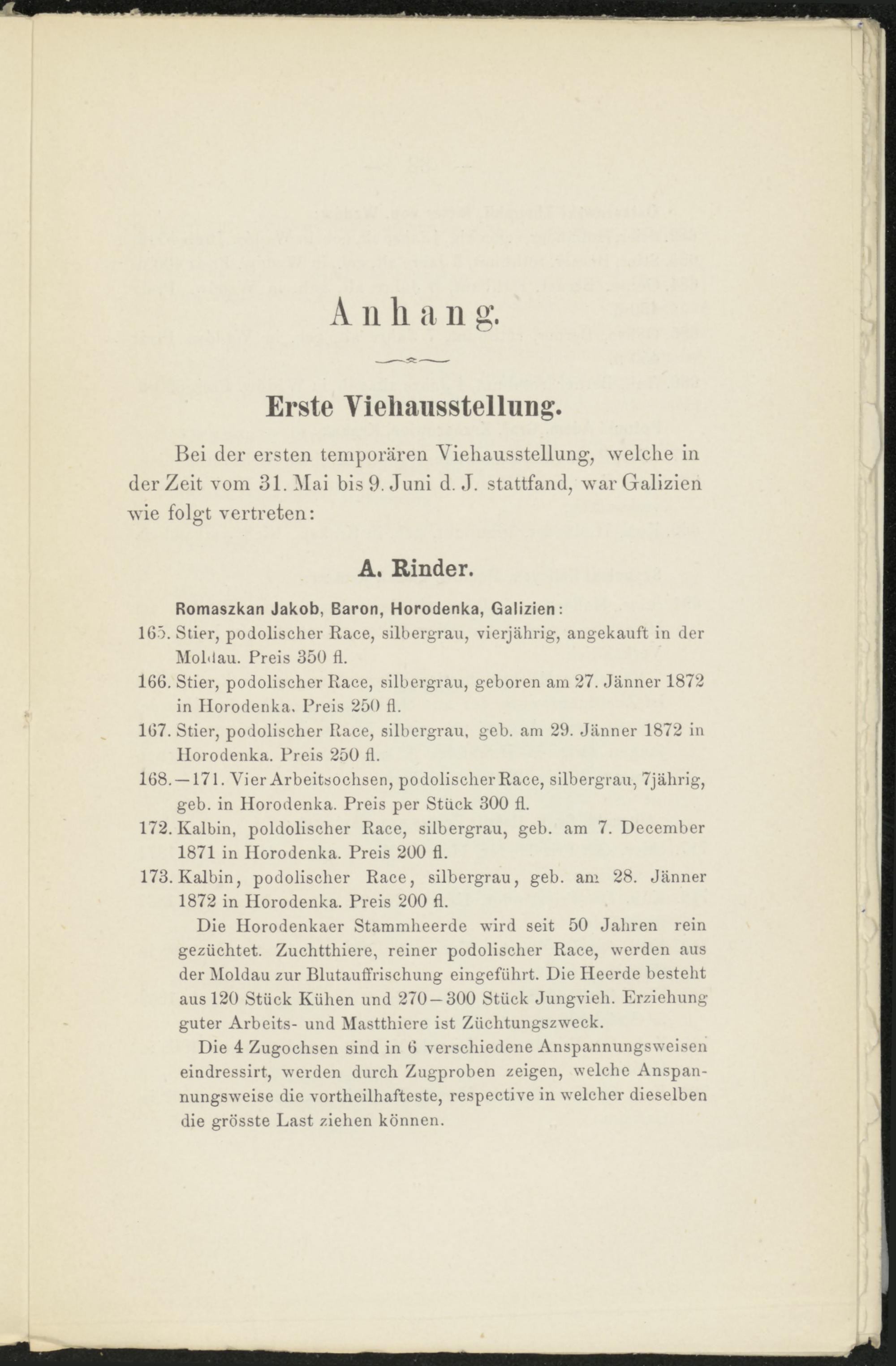 168. —171. Vier Arbeitsochsen, podolischer Race, silbergrau, 7jährig, geb. in Horodenka. Preis per Stück 300 fl.