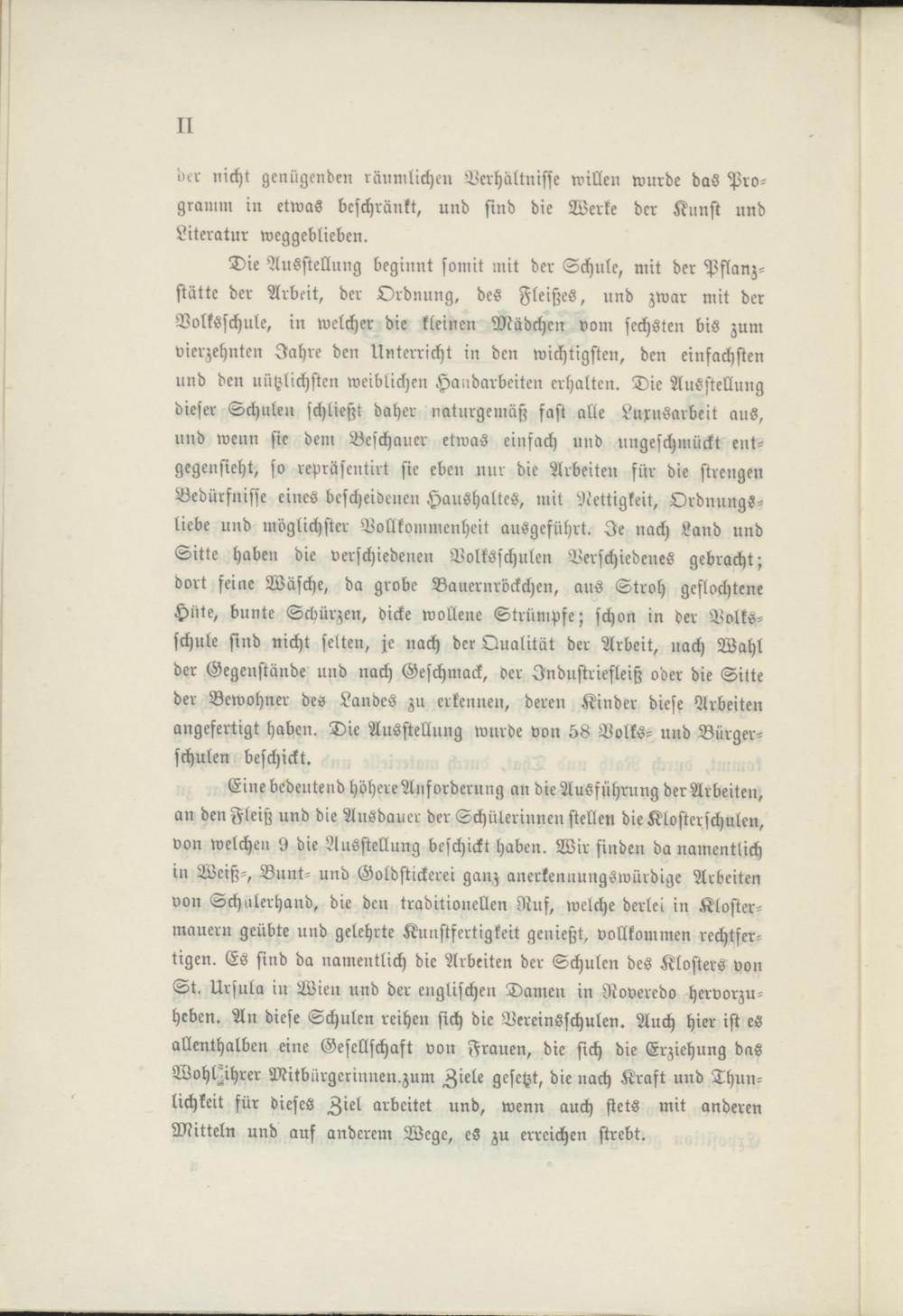 Eine bedeutend höhere Anforderung an die Ausführung der Arbeiten, an den Fleiß und die Ausdauer der Schülerinnen stellen die Klosterschulen, von welchen 9 die Ausstellung beschickt haben. Wir finden da namentlich in Weiß-, Bunt- und Goldstickerei ganz anerkennungswürdige Arbeiten von Schulerhand, die den traditionellen Ruf, welche derlei in Klostermauern geübte und gelehrte Kunstfertigkeit genießt, vollkommen rechtfertigen. Es sind da namentlich die Arbeiten der Schulen des Klosters von St. Ursula in Wien und der englischen Damen in Roveredo hervorzuheben. An diese Schulen reihen sich die Vereinsschulen. Auch hier ist es allenthalben eine Gesellschaft von Frauen, die sich die Erziehung das Wohl^ihrer Mitbürgerinnen.zum Ziele gesetzt, die nach Kraft und Thun- lichkeit für dieses Ziel arbeitet und, wenn auch stets mit anderen Mitteln und auf anderem Wege, eS zu erreichen strebt.