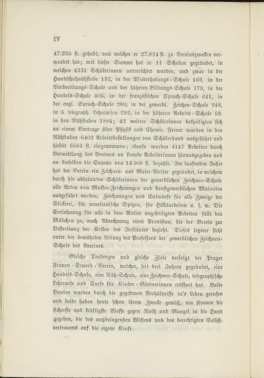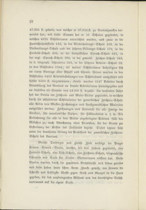 Gleiche Tendenzen und gleiche Ziele verfolgt der Präger Frauen - Erwerb - Verein, welcher, seit drei Jahren gegründet, eine Handels-Schule, eine Näh-Schule, eine Zeichnen-Schule, telegraphische Lehrcurse und Curse für Kinder - Gärtnerinnen eröffnet hat. Beide Vereine wurden durch die gegebenen Verhältnisse in's Leben gerufen und beide haben heute schon ihrem Zwecke gemäß, den Frauen die sicherste und kräftigste Waffe gegen Noth und Mangel in die Hand gegeben, die des nutzbringenden Wissens und des berechtigten Selbstvertrauens auf die eigene Kraft.
