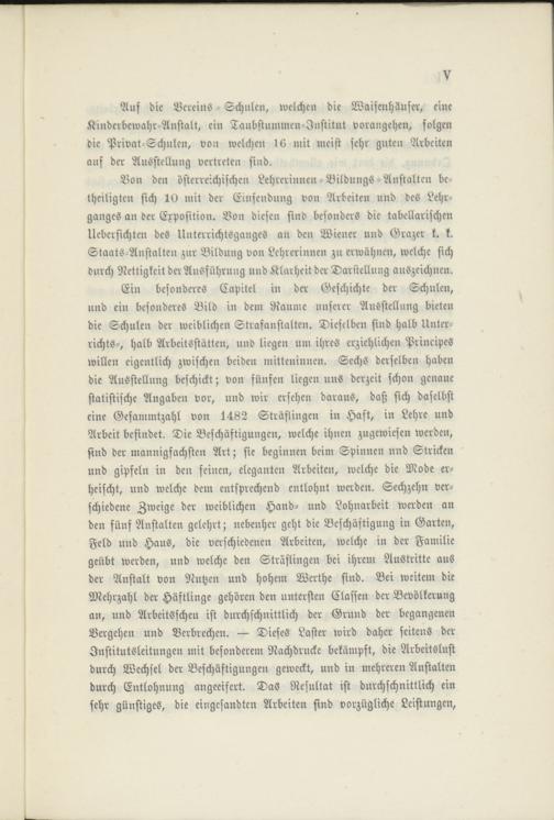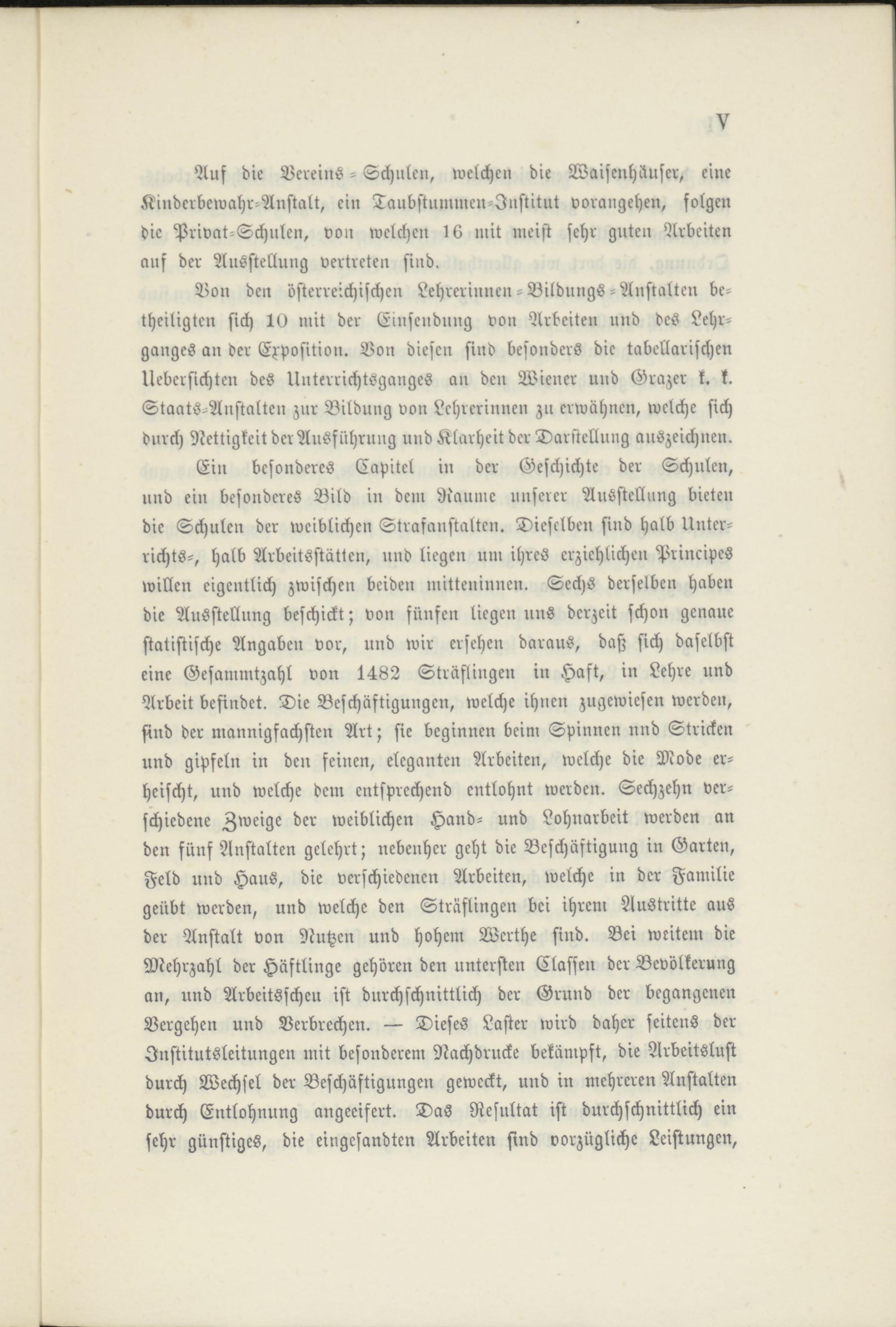 Ein besonderes Capitel in der Geschichte der Schulen, nnd ein besonderes Bild in dem Raume unserer Ausstellung bieten die Schulen der weiblichen Strafanstalten. Dieselben sind halb Unterrichts-, halb Arbeitsstätten, und liegen um ihres erziehlichen Principes willen eigentlich zwischen beiden mitteninnen. Sechs derselben haben die Ausstellung beschickt; von fünfen liegen nus derzeit schon genaue statistische Angaben vor, und wir ersehen daraus, daß sich daselbst eine Gesammtzahl von 1482 Sträflingen in Haft, in Lehre und Arbeit befindet. Die Beschäftigungen, welche ihnen zugewiesen werden, sind der mannigfachsten Art; sie beginnen beim Spinnen nnd Stricken und gipfeln in den feinen, eleganten Arbeiten, welche die Mode erheischt, und welche dem entsprechend entlohnt werden. Sechzehn verschiedene Zweige der weiblichen Hand- und Lohnarbeit werden an den fünf Anstalten gelehrt; nebenher geht die Beschäftigung in Garten, Feld und Haus, die verschiedenen Arbeiten, welche in der Familie geübt werden, und welche den Sträflingen bei ihrem Austritte aus der Anstalt von Nutzen und hohem Werthe sind. Bei weitem die Mehrzahl der Häftlinge gehören den untersten Classen der Bevölkerung an, und Arbeitsscheu ist durchschnittlich der Grund der begangenen Vergehen und Verbrechen. — Dieses Laster wird daher seitens der Institutsleitungen mit besonderem Nachdrucke bekämpft, die Arbeitslust durch Wechsel der Beschäftigungen geweckt, und in mehreren Anstalten durch Entlohnung angeeifert. Das Resultat ist durchschnittlich ein sehr günstiges, die eingesandten Arbeiten sind vorzügliche Leistungen,