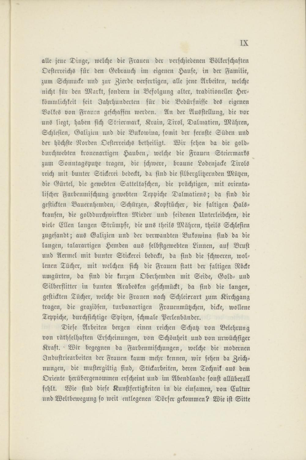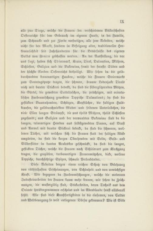 Diese Arbeiten bergen einen reichen Schatz von Belehrung von räthselhaften Erscheinungen, von Schönheit und von urwüchsiger Kraft. > Wir begegnen da Farbenmischungen, welche die modernen Industriearbeiter: der Frauen kaum mehr kennen, wir sehen da Zeichnungen, die mustergiltig sind, Stickarbeiten, deren Technik aus dem Oriente herübergenommen erscheint und im Abendlande sonst allüberall fehlt. Wie sind diese Kunstfertigkeiten in die einsamen, von Cultur und Weltbewegung so weit entlegenen Dörfer gekommen? Wie ist Sitte