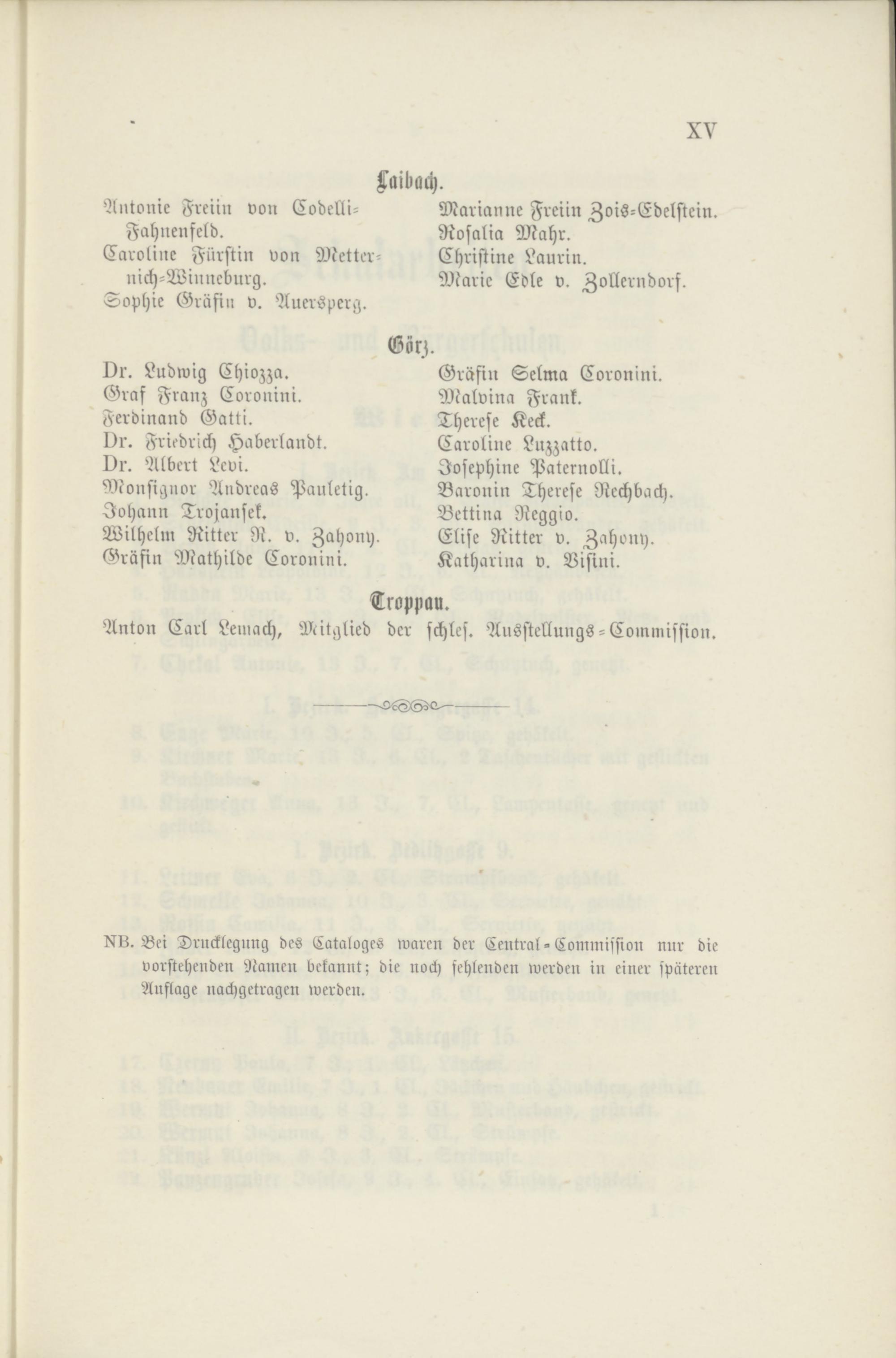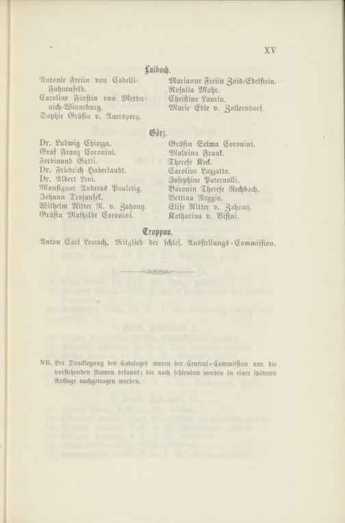 Bei Drucklegung des Cataloges waren der Central-Commission nur die vorstehenden Namen bekannt; die noch fehlenden werden in einer späteren Auflage nachgetragen werden.