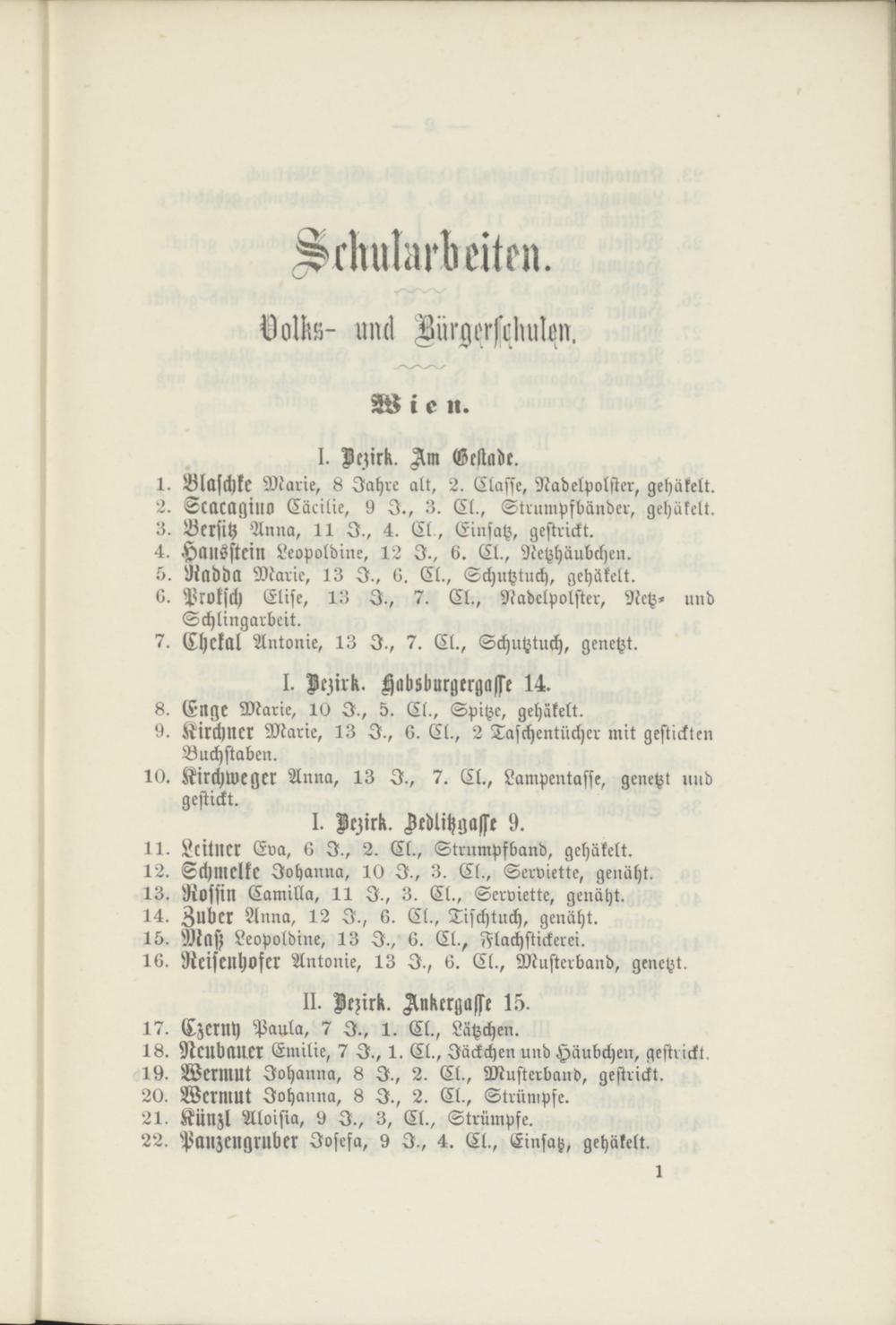 18. Neubauer Emilie, 7 I., 1. Cl., Jäckchen und Häubchen, gestrickt. Ist. Wermut Johanna, 8 I., 2. Cl., Musterband, gestrickt.