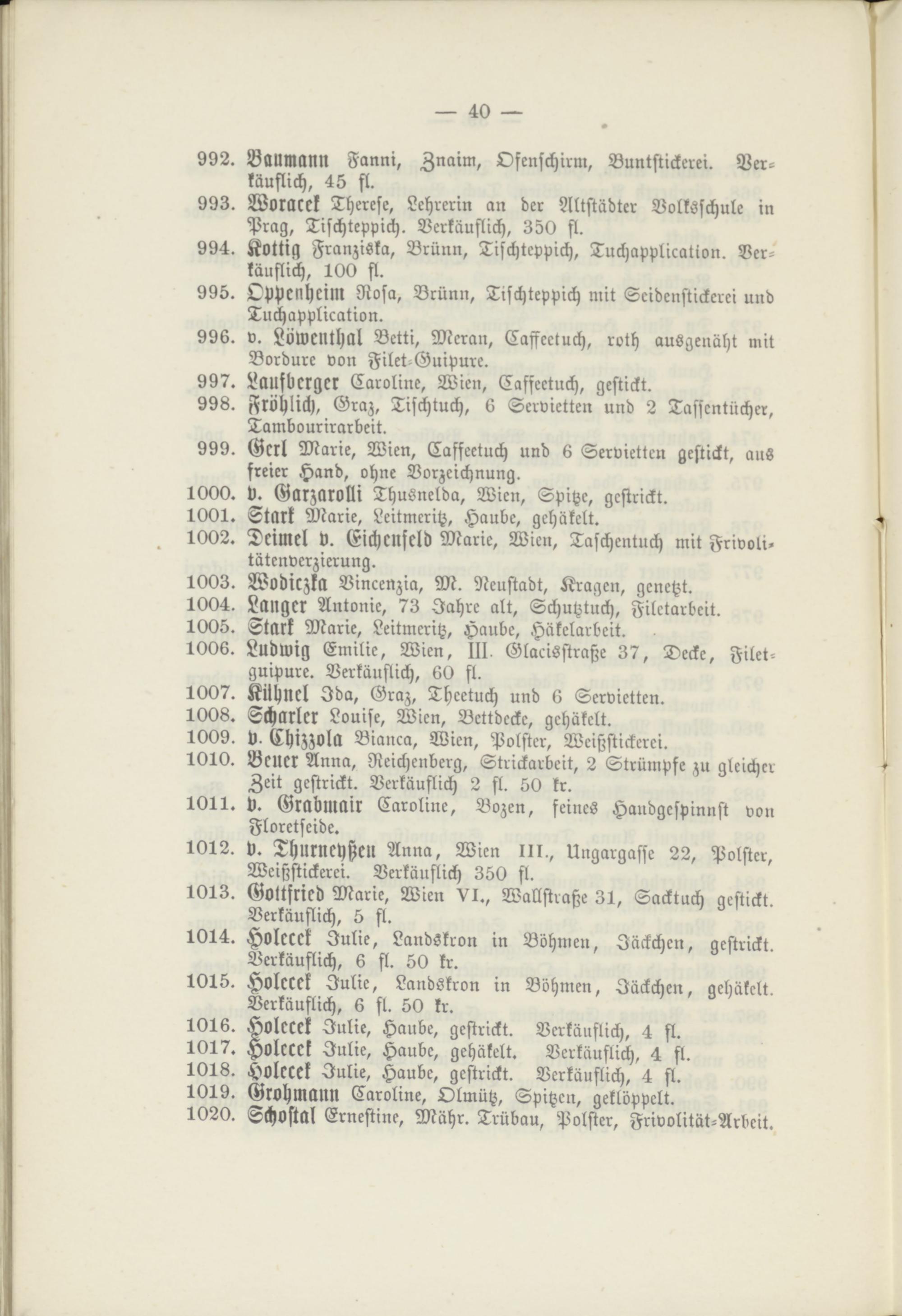 1012. p. Thurneyßen Anna, Wien m., Ungargasse 22, Polster, Weißstickerei. Verkäuflich 350 fl.