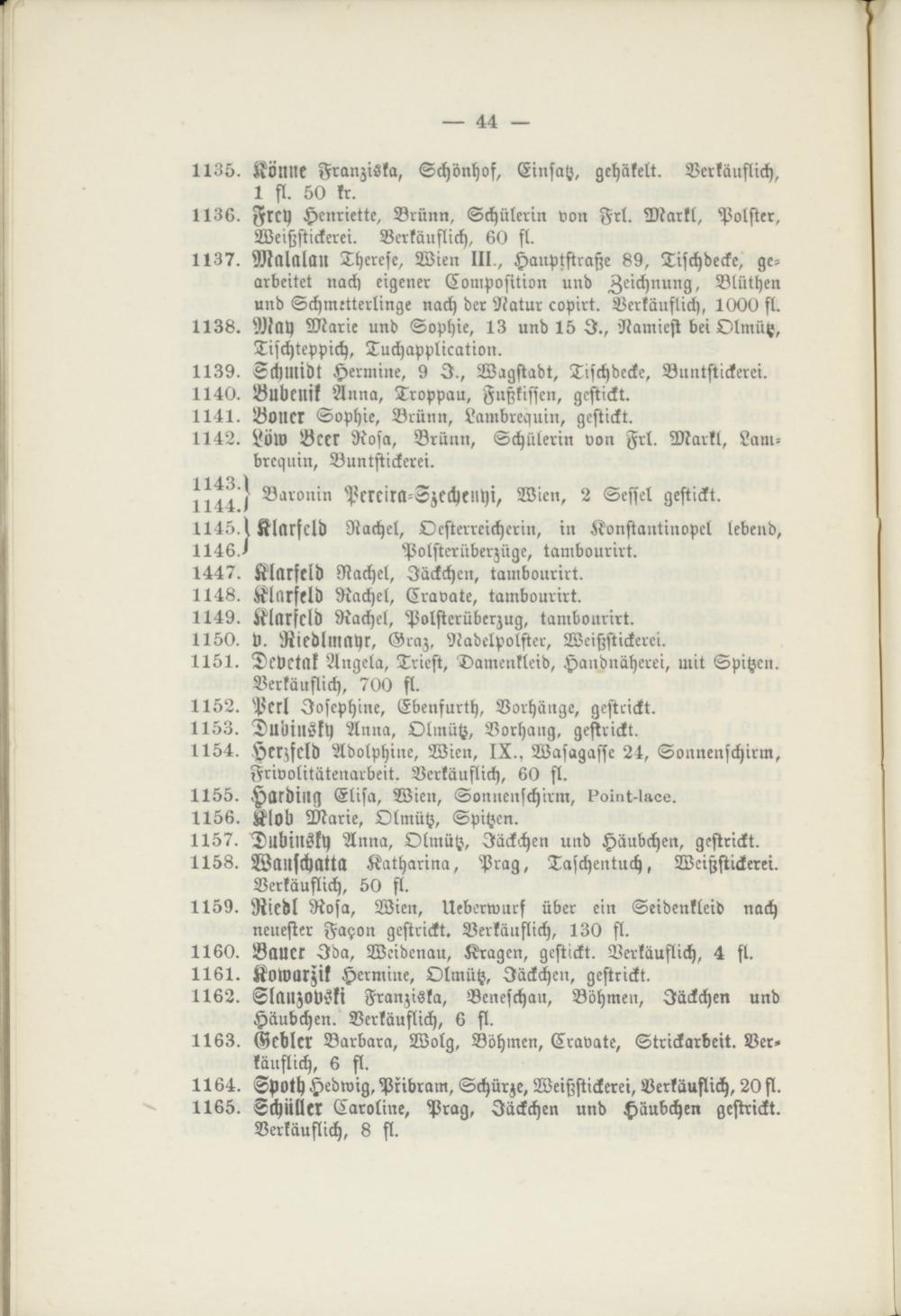 1136. Frey Henriette, Brunn, Schülerin von Frl. Markt, Polster, Weißstickerei. Verkäuflich, 60 fl.