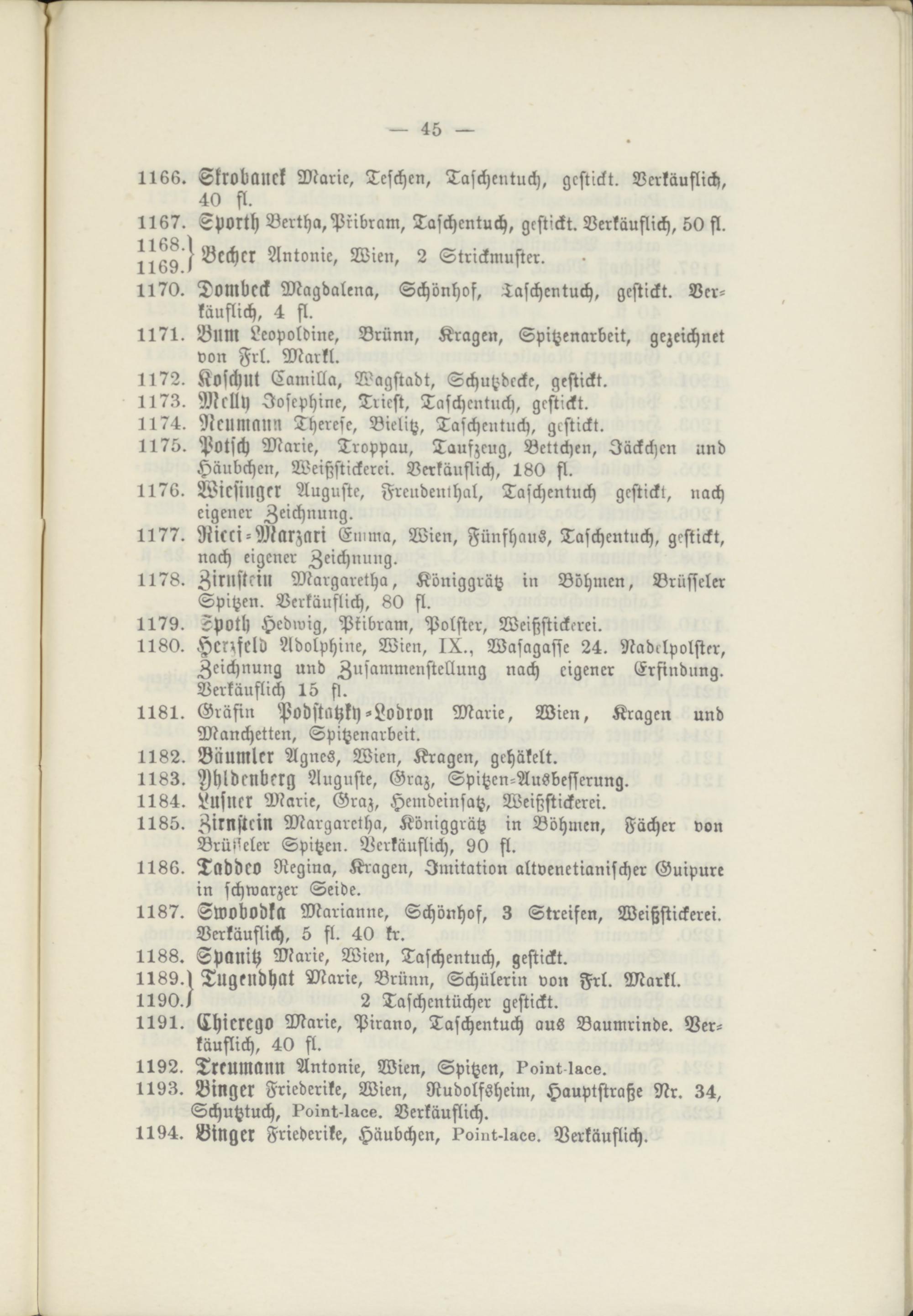 1178. Zirnsteiu Margarethe», Königgrätz in Böhmen, Brüsseler Spitzen. Verkäuflich, 80 fl.