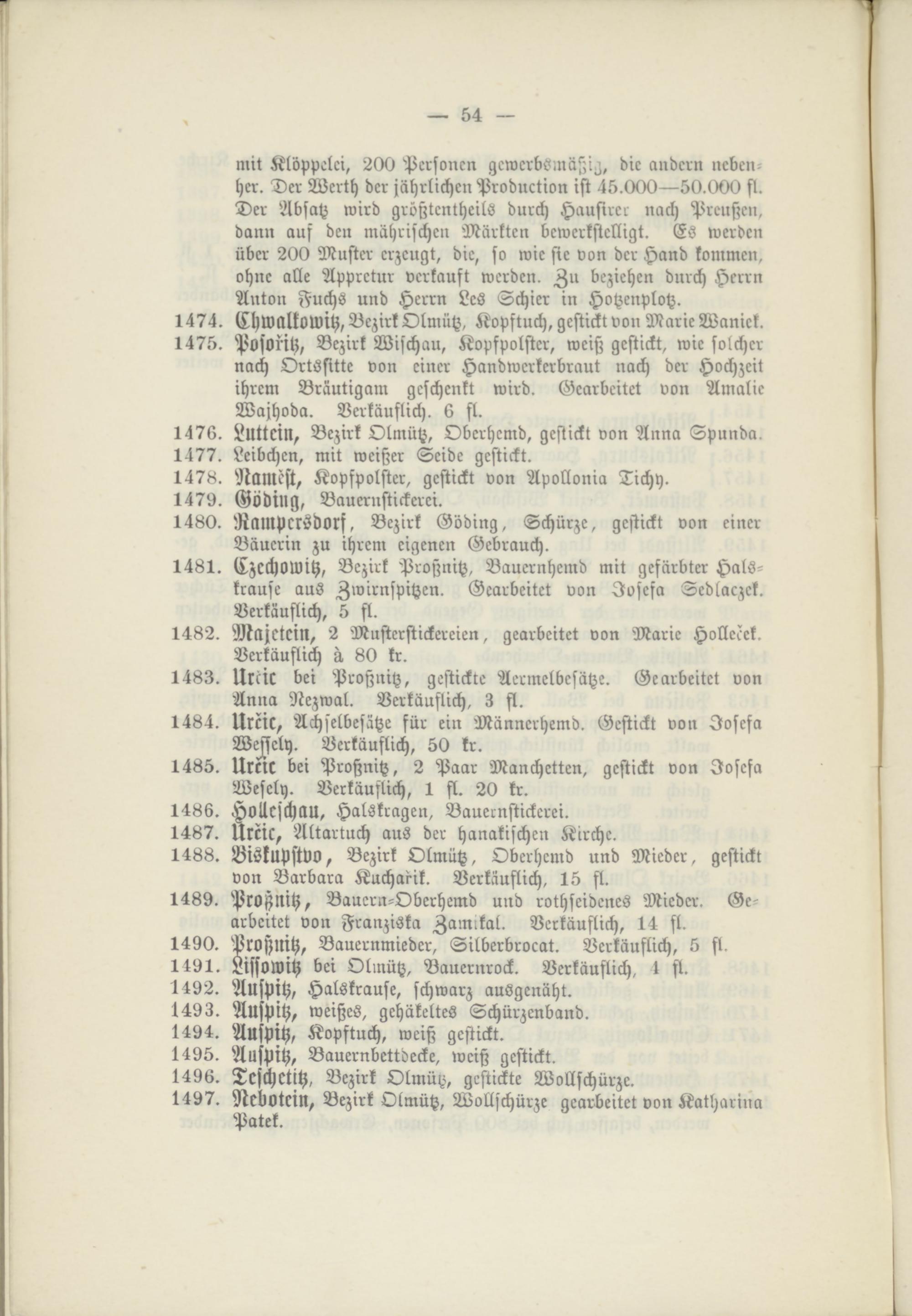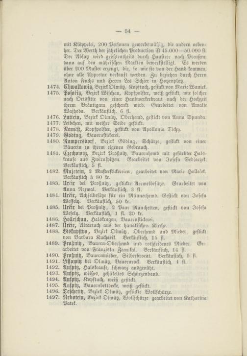 mit Klöppelei, 200 Personen gewerbsmäßig, die andern nebenher. Der Werth der jährlichen Production ist 45.000—50.000 st. Der Absatz wird größtentheilö durch Hausirce nach Preußen, dann auf den mährischen Märkten bewerkstelligt. Es werden über 200 Muster erzeugt, die, so wie sie von der Hand kommen, ohne alle Appretur verkauft werden. Zu beziehen durch Herrn Anton Fuchs und Herrn Les Schier in Hotzenplotz.
