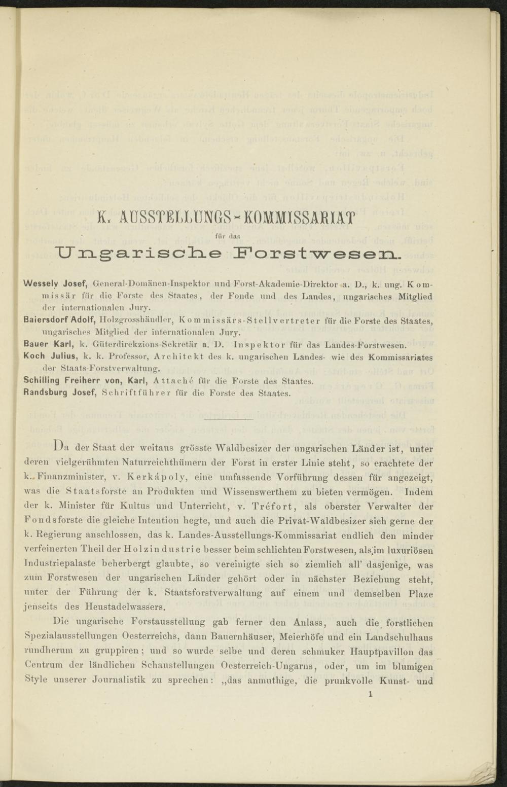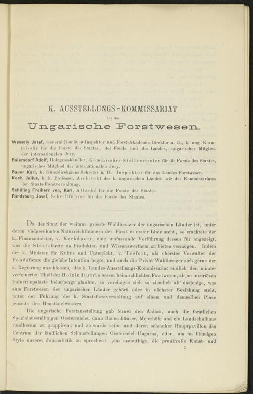 11a der Staat der weitaus grösste Waldbesizer der ungarischen Länder ist, unter deren vielgeriihmten Naturreichtliiiinern der Forst in erster Linie steht, so erachtete der k. Finanzminister, v. Kerkäpoly, eine umfassende Vorführung dessen für angezeigt, was die Staatsforste an Produkten und Wissenswerthem zu bieten vermögen. Indem der k. Minister für Kultus und Unterricht, v. Trefort, als oberster Verwalter der Fondsforste die gleiche Intention hegte, und auch die Privät-Waldbesizer sich gerne der k. Legierung anschlossen, das k. Landes-Ausstellungs-Kommissariat endlich den minder verfeinerten Theil der Holzindustrie besser beim schlichten Forstwesen, als.im luxuriösen Industriepalaste beherbergt glaubte, so vereinigte sich so ziemlich all’ dasjenige, was zum Forstwesen der ungarischen Länder gehört oder in nächster Beziehung steht, unter der Führung der k. Staatsforstverwaltung auf einem und demselben Plaze jenseits des Heustadelwassers.