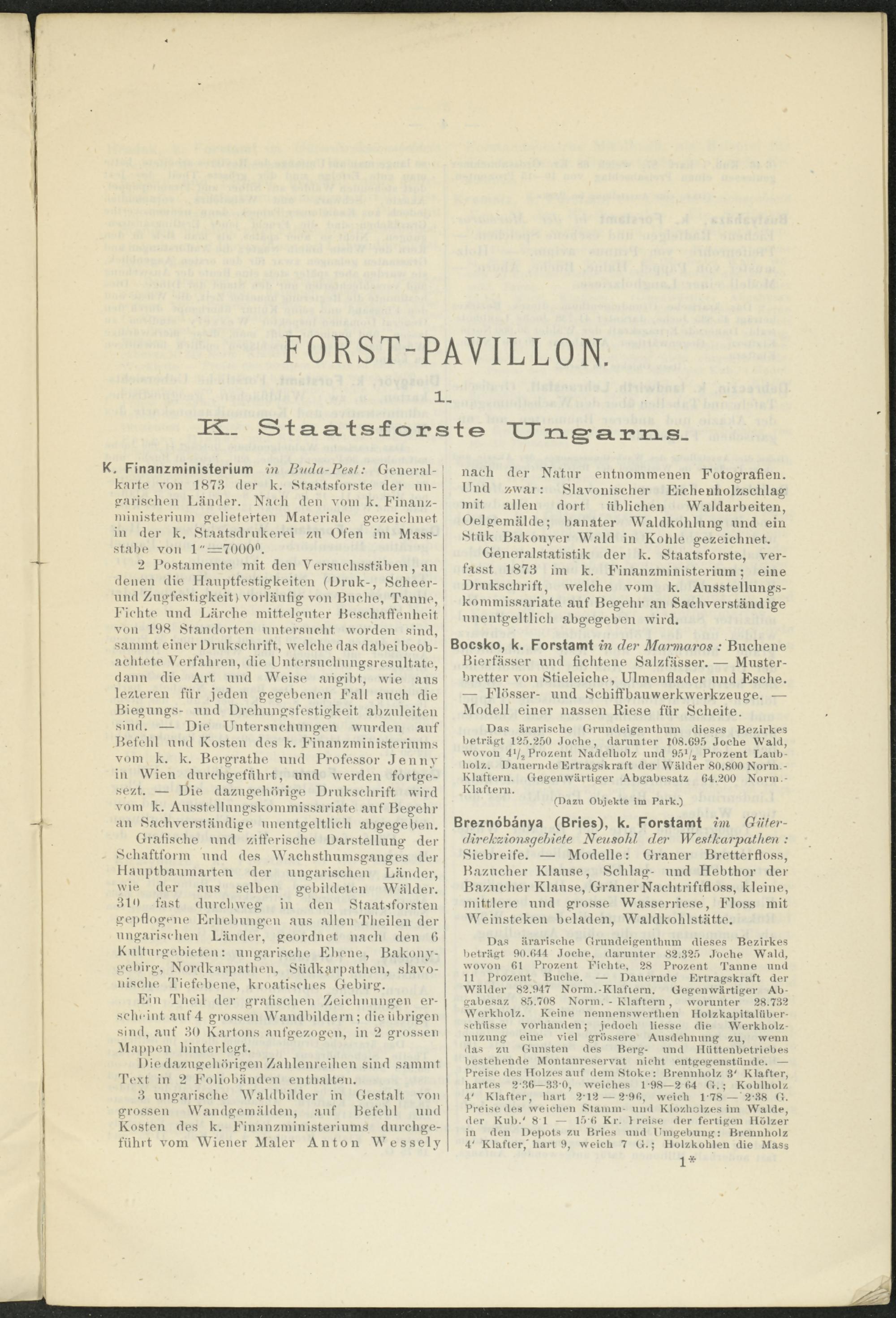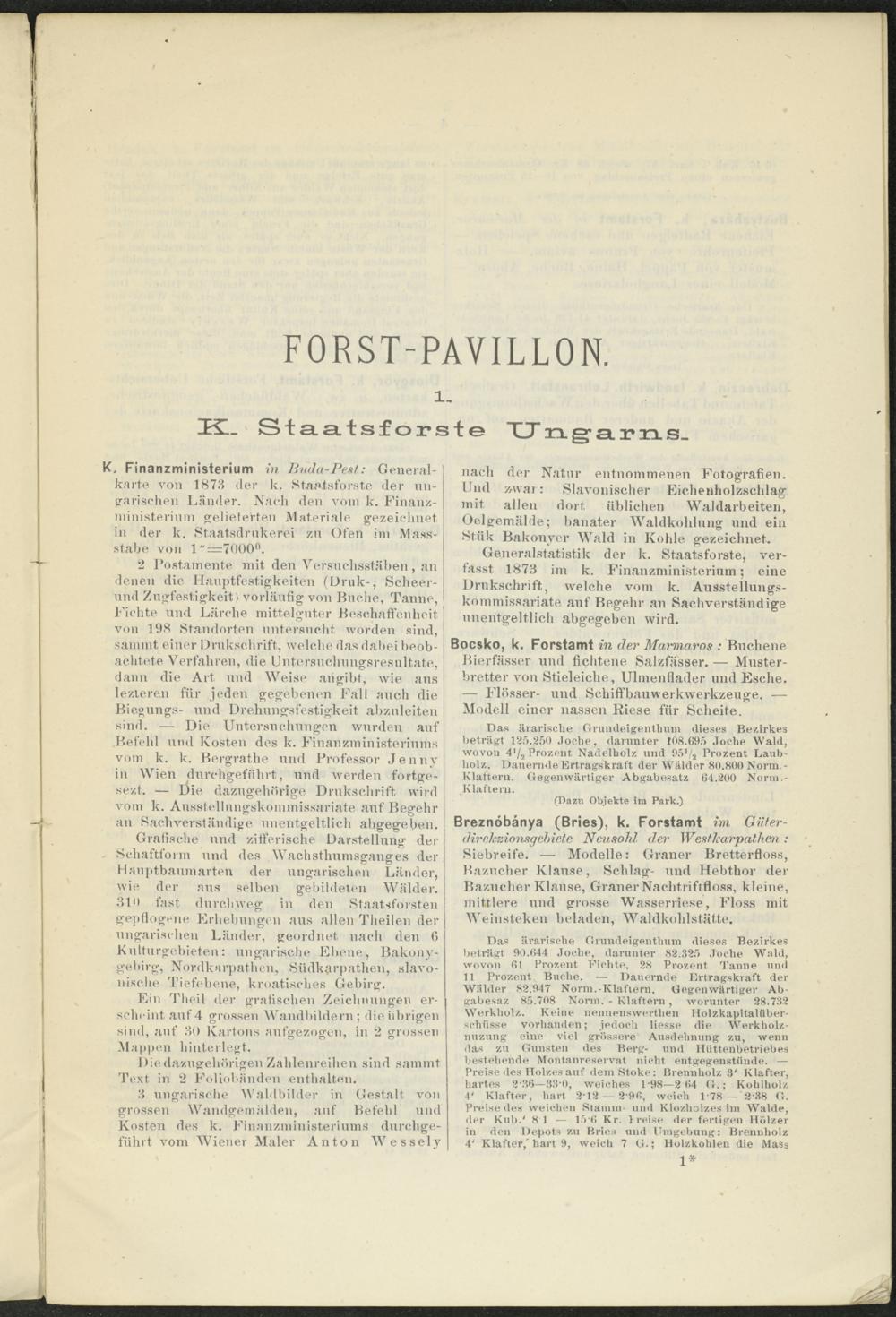 Generalstatistik der k. Staatsforste, verfasst 1873 im k. Finanzministerium; eine Drnkschrift, welche vom k. Ausstellungskommissariate auf Begehr an Sachverständige unentgeltlich abgegeben wird.