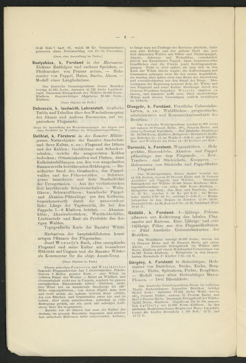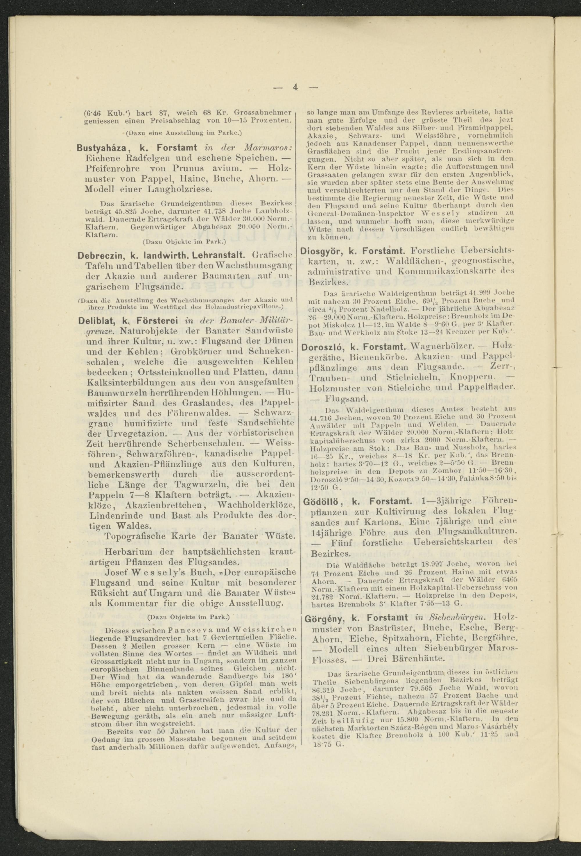 Deliblat, k. Försterei in der Banater Militärgrenze. Naturobjekte, der Banater Sandwüste und ihrer Kultur, u. zw.: Flugsand der Dünen und der Kehlen; Grobkörner und Selineken- schalen, welche die ausgewehten Kehlen bedecken ; Ortssteinknollen und Platten, dann Kalksinterbildungen aus den von ausgefaulten Baumwurzeln herrührenden Höhlungen. — Hu- mifizirter Sand des Graslandes, des Pappelwaldes und des Föhrenwaldes. — Schwarzgraue humifizirte und feste Sandschichte der Urvegetazion. — Aus der vorhistorischen Zeit herrührende Seherbenschalen. — Weissföhren-, Schwarzföhren-, kanadische Pappelund Akazien-Pflänzlinge aus den Kulturen, bemerkenswerth durch die ausserordentliche Länge der Tagwurzeln, die bei den Pappeln 7—8 Klaftern beträgt. — Akazien- klöze, Akazienbrettchen, Wachholderklöze, Lindenrinde und Bast als Produkte des dortigen Waldes.