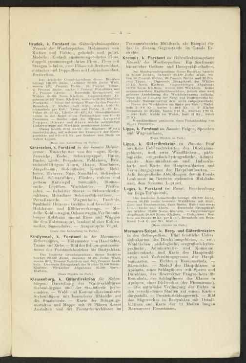 in den Ostkarpathen. Fünf forstliche Ueber- sichtskarten des Direkzionsgebietes, n. zw.: Waldflächen-, pädologisclie, orografisch-hydrografische , Administrativ- und Kommuni- kazionenkarte und Karte der Hauptwald arten und Verbreitungsgrenze der Hauptbaumarten. — Fichtenes Resonanzholz. — Bärendeke. — Modell der Hauptklause in Apsinetz, eines Schlagthores mit Sperre und Durchlass, des Roszuskaer Fangrechens für Brennholz, des Schlagthores der Klause in Apsinetz, eines Dielwerkes (der Flossstrasse).
