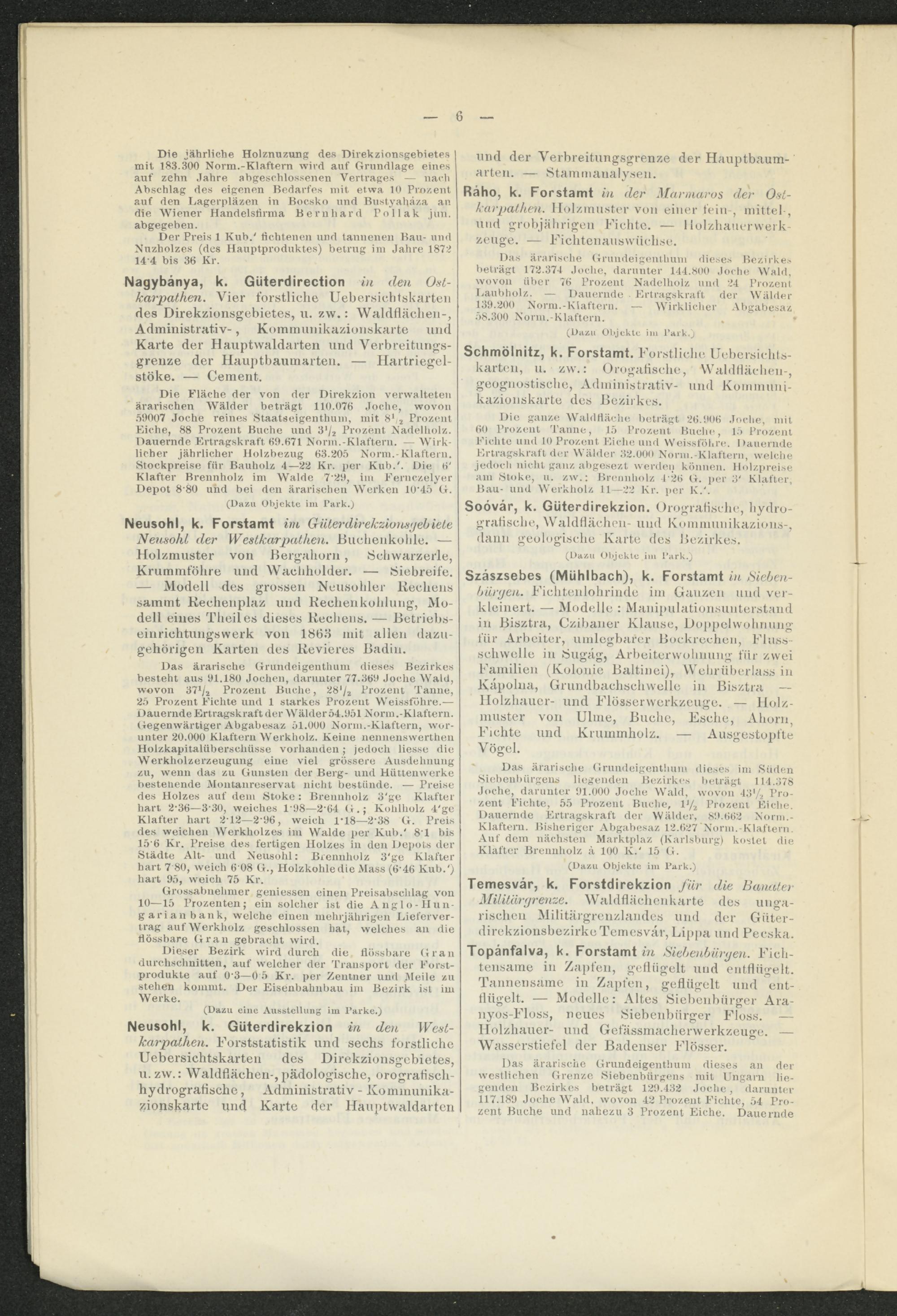 Die Fläche der von der Direkzion verwalteten ärarischen Wälder beträgt 110.076 Joche, wovon 59007 Joche reines Staatseigenthum, mit 8 1 2 Prozent Eiche, 88 Prozent Buche und Prozent Nadelholz. Dauernde Ertragskraft 69.671 Norm.-Klaftern. — Wirklicher jährlicher Holzbezug 63.205 Norm.-Klaftern, Stockpreise für Bauholz 4—22 Kr. per Kuh.'. Die 6' Klafter Brennholz im Walde 7'29, im Fernczelyer Depot 8'80 und bei den ärarischen Werken 10'45 G.
