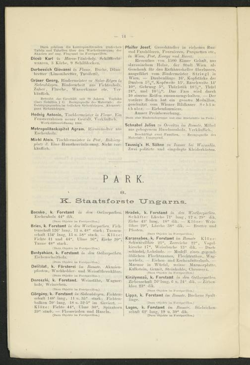 Karansebes, k. Forstamt im Banate Klöze: Schwarzföhre 21", Zerreiche 22", Vogelkirsche 17", Weissbuche 13" dik. -- Dachschindel, Lohrinde. — Modell eines gegendüblichen Flechtzaunes, Flechtruthen, Wagnerholz. — Eichen- und Eschenfutterlaub. — Marmor in Würfel, weisse Marmorplatte, Kalkstein, Granit, Steinkohle, Chromerz.