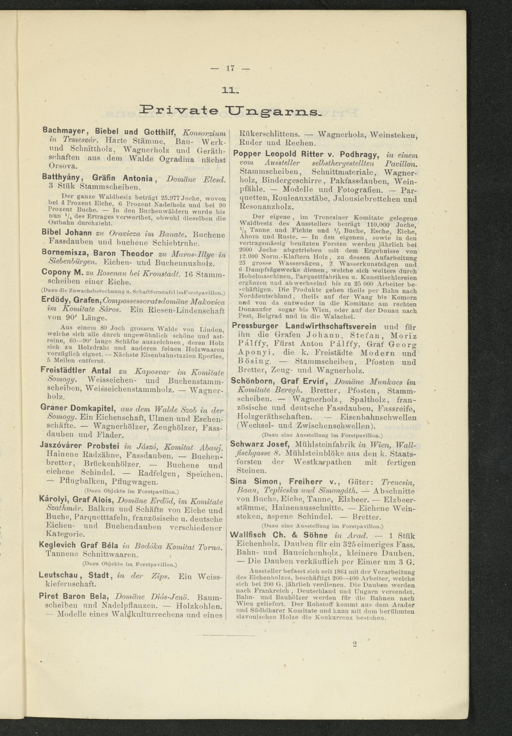 Aussteller befasst sich seit 1864 mit der Verarbeitung des Eichenholzes, beschäftigt 200—400 Arbeiter, welche sich bei 200 Gr. jährlich verdienen. Die Dauben werden nach Frankreich , Deutschland und Ungarn versendet. Bahn- und Bauhölzer werden für die Bahnen nach Wien geliefert. Der Rohstoff kommt aus dem Arader und Siidbiliarer Komitate und kann mit dem berühmten slavonischen Holze die Konkurrenz bestehen.