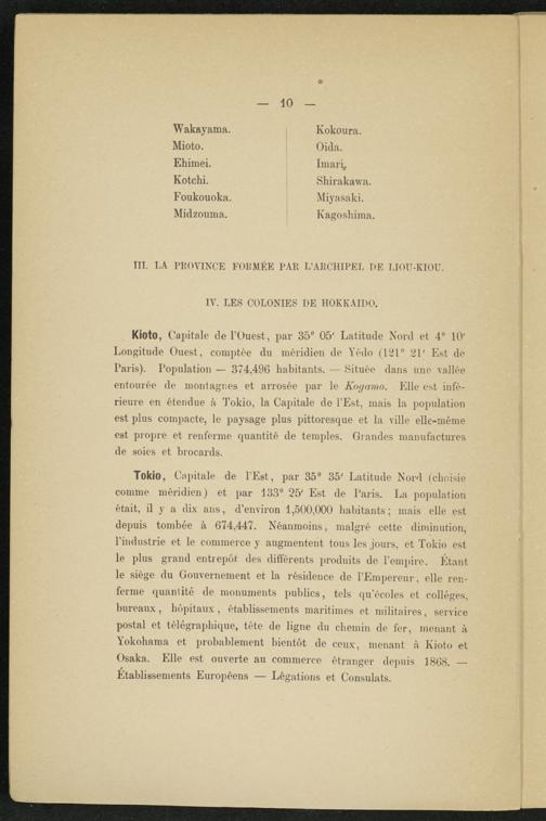 Tokio, Capitale de l’Est, par 35° 35' Latitude Nord (choisie comme méridien) et par 133° 25' Est de Paris. La population était, il y a dix ans, d’environ 1,500,000 habitants; mais elle est depuis tombée à 674,447. Néanmoins, malgré cette diminution, l’industrie et le commerce y augmentent tous les jours, et Tokio est le plus grand entrepôt des différents produits de l’empire. Étant le siège du Gouvernement et la résidence de l’Empereur, elle renferme quantité de monuments publics, tels qu’écoles et collèges, bureaux, hôpitaux , établissements maritimes et militaires, service postal et télégraphique, tête de ligne du chemin de fer, menant à Yokohama et probablement bientôt de ceux, menant à Kioto et Osaka. Elle est ouverte au commerce étranger depuis 1868. — Etablissements Européens — Légations et Consulats.