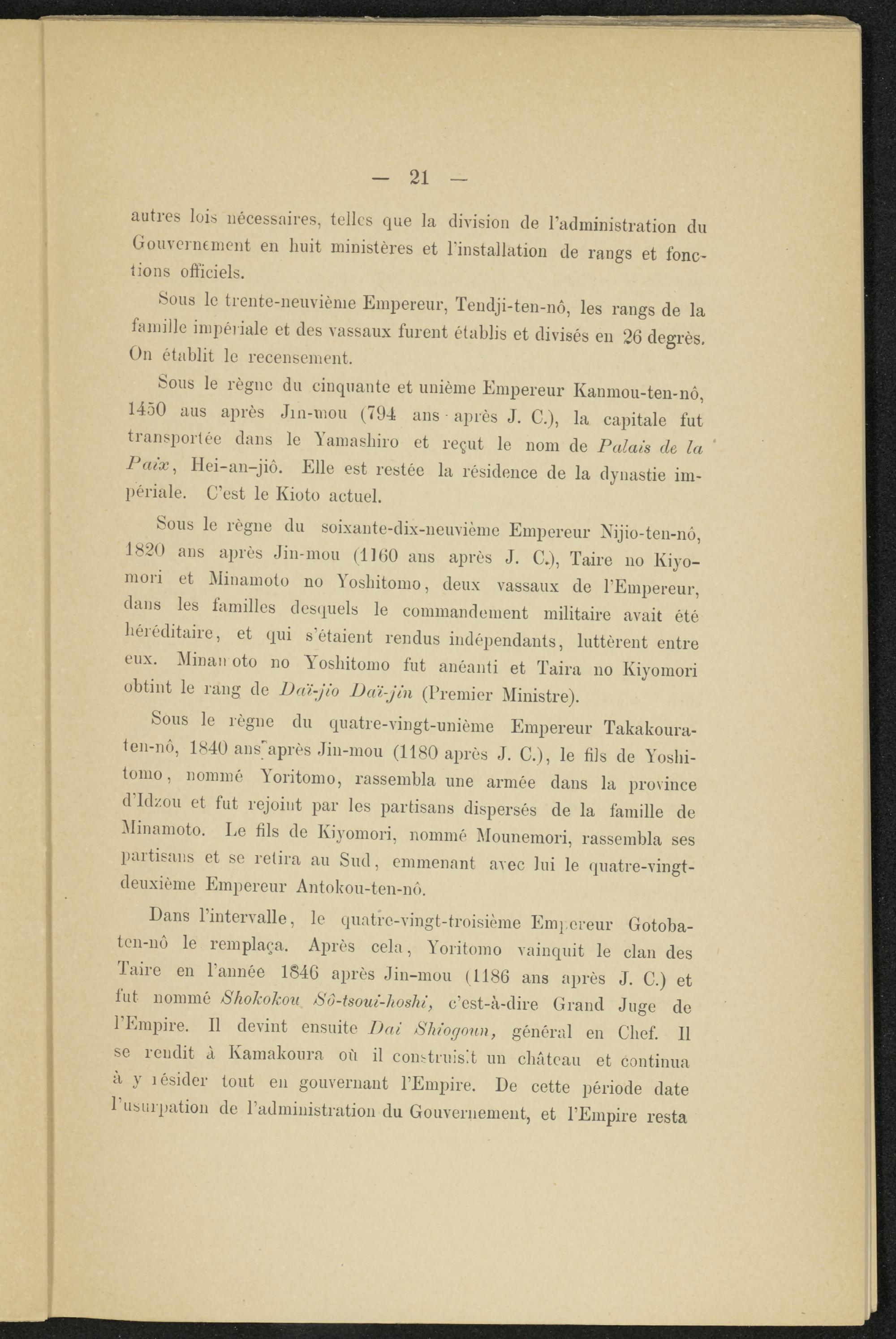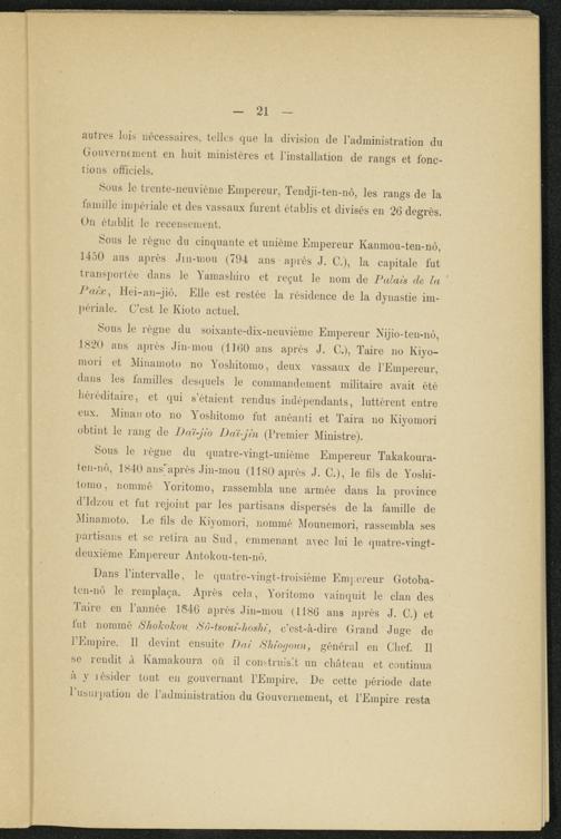 Sous le règne du soixante-dix-neuvième Empereur Nijio-ten-nô, 1820 ans après Jin-mou (1160 ans après J. C.), Taire no Kiyo- mori et Minamoto no Yoshitomo, deux vassaux de l’Empereur, dans les familles desquels le commandement militaire avait été héréditaire, et qui s’étaient rendus indépendants, luttèrent entre eux. Minamoto no Yoshitomo fut anéanti et Taira no Kiyomori obtint le rang de Daï-jio Ddi-jin (Premier Ministre).