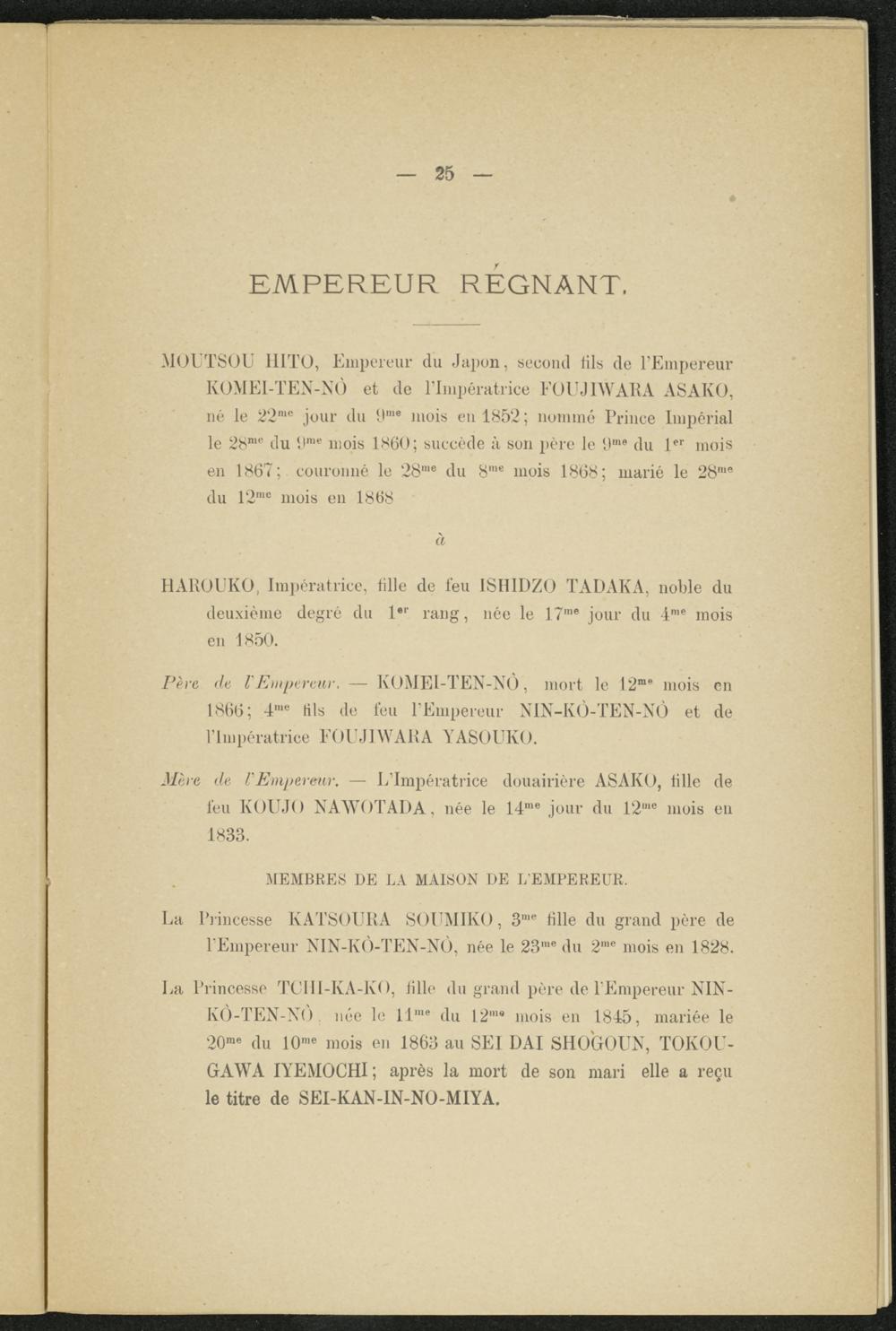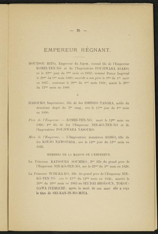 YIOLTSOU IIITO, Empereur du Japon, second lils de l’Empereur KOMEI-TEX-NO et de l’Impératrice FOUJIWAliA ASAKO, né le 22 ,nc jour du fl me mois en 1852 ; nommé Prince Impérial le 28 mp du < J me mois 1860; succède à son père le D me du 1 er mois en 1867; couronné le 28 me du 8 me mois 1868; marié le 28 me du 12 mc mois en 1868