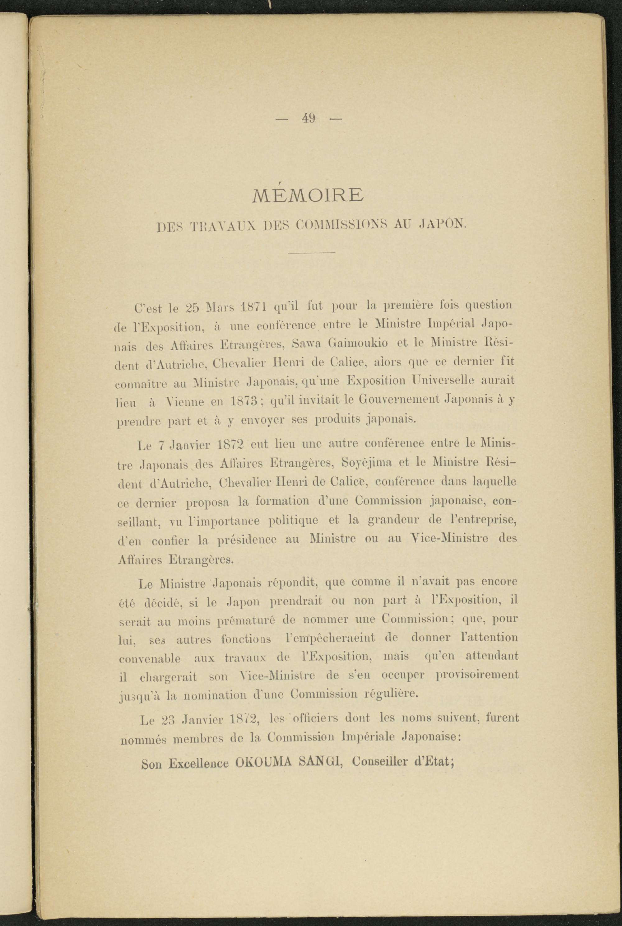 C’est le 25 Murs 1871 qu'il fut pour lu première fois question de l'Exposition, à une conférence entre le Ministre Impérial Japonais des Affaires Etrangères, Sawa Gaimoukio et le Ministre Rési- dent d’Autriche, Chevalier Henri de Calice, alors que ce dernier fit connaître au Ministre Japonais, qu'une Exposition Universelle aurait lieu à Vienne en 1873; qu’il invitait le Gouvernement Japonais à y prendre part et à y envoyer ses produits japonais.