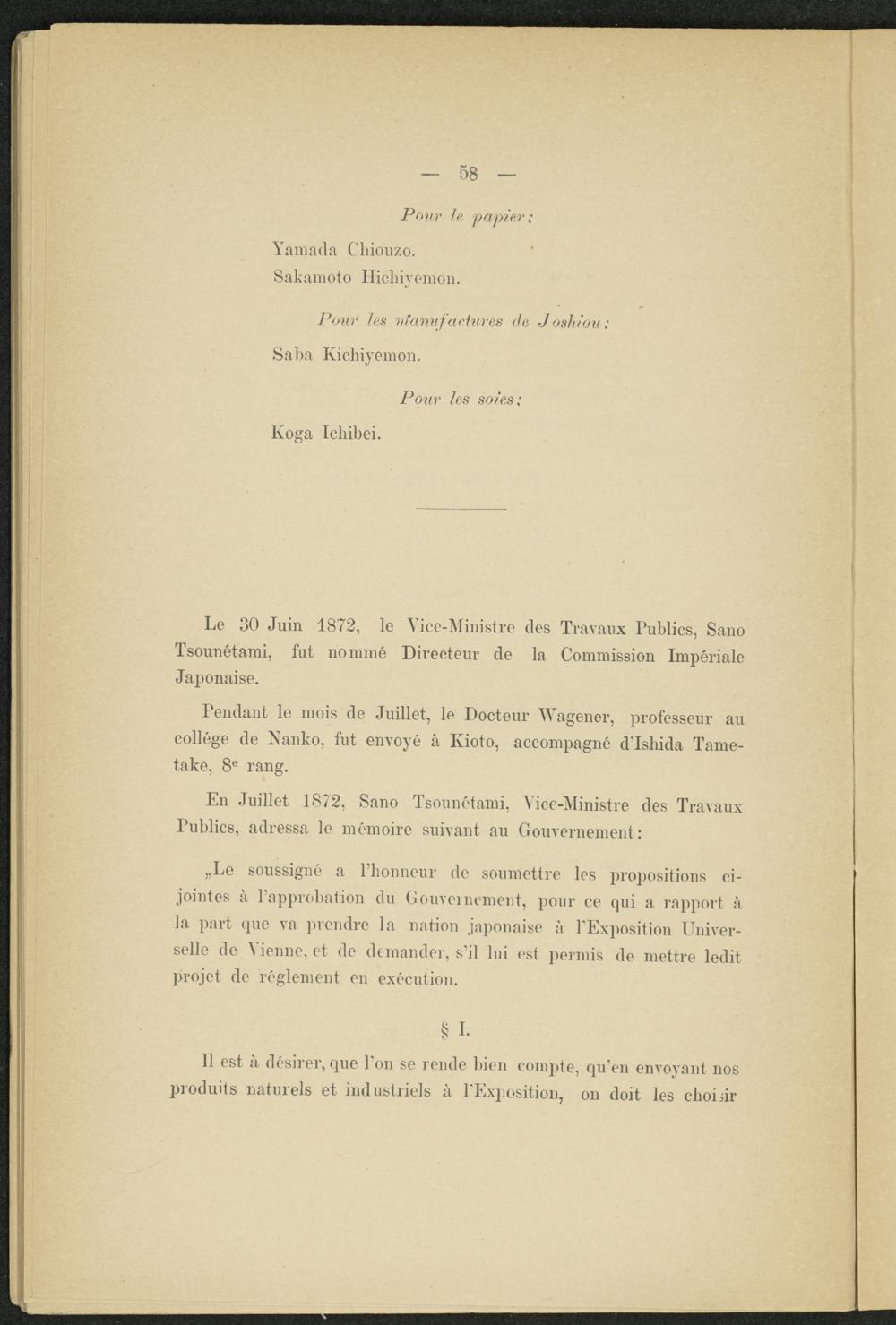 Le 30 Juin 1872, le Vice-Ministre des Travaux Publics, Sano Tsounétami, fut nommé Directeur de la Commission Impériale Japonaise.
