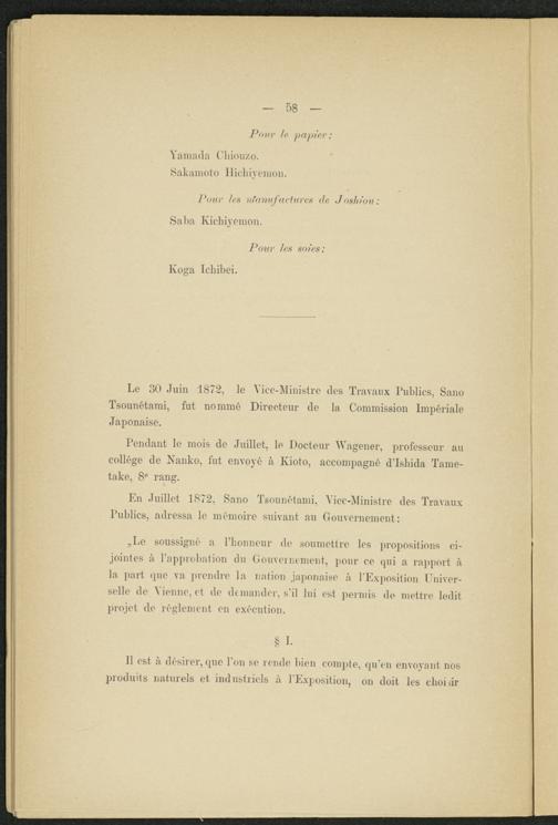 „Le soussigné a l’bonneur de soumettre les propositions ci- jointes à l’approbation du Gouvernement, pour ce qui a rapport à la part que va prendre la nation japonaise à l'Exposition Universelle de Vienne, et de demander, s'il lui est permis de mettre ledit projet de réglement en exécution.