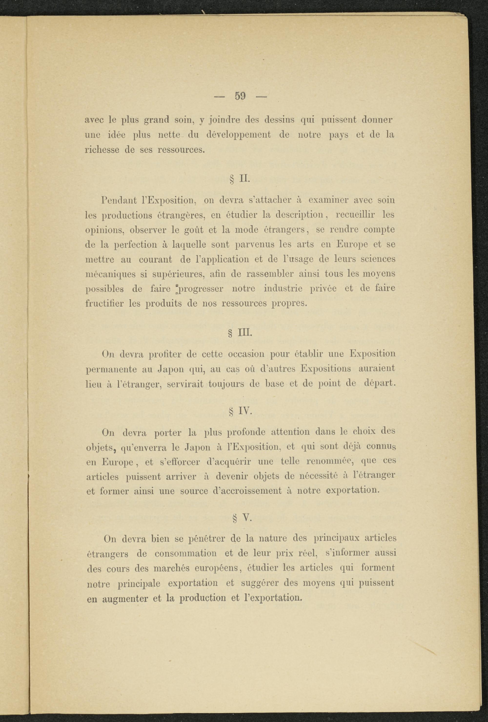 On devra porter la plus profonde attention dans le choix des objets, qu’enverra le Japon à l’Exposition, et qui sont déjà connus en Europe, et s’efforcer d’acquérir une telle renommée, que ces articles puissent arriver à devenir objets de nécessité à l’étranger et former ainsi une source d’accroissement à notre exportation.