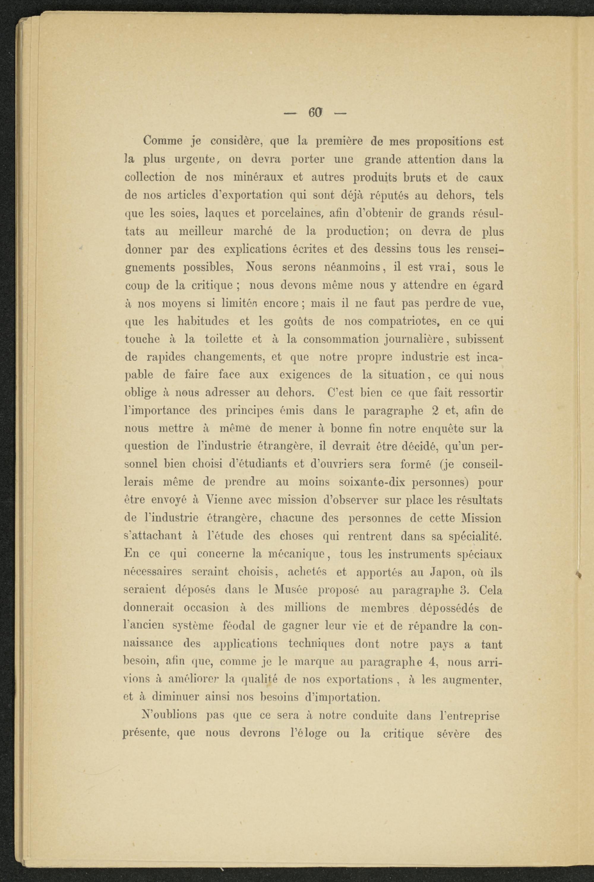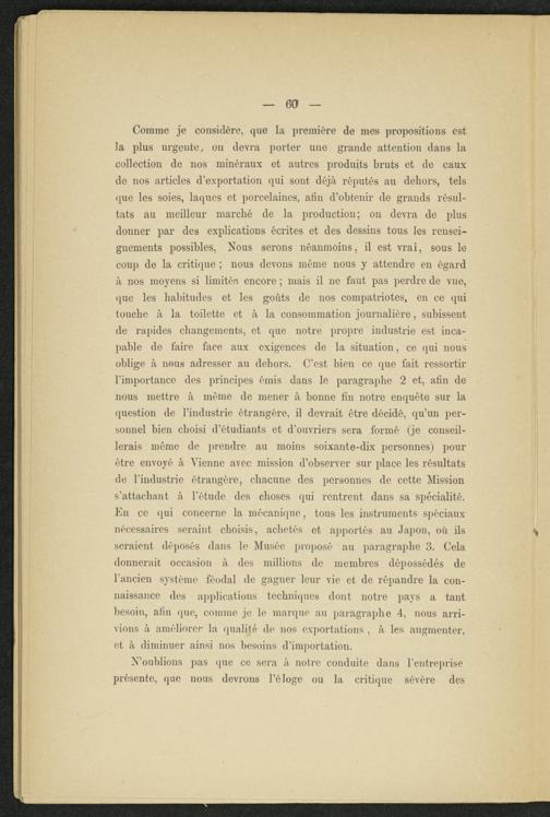 Comme je considère, que la première de mes propositions est la plus urgente, on devra porter une grande attention dans la collection de nos minéraux et autres produits bruts et de eaux de nos articles d’exportation qui sont déjà réputés au dehors, tels que les soies, laques et porcelaines, afin d’obtenir de grands résultats au meilleur marché de la production; on devra de plus donner par des explications écrites et des dessins tous les renseignements possibles, Nous serons néanmoins, il est vrai, sous le coup de la critique ; nous devons même nous y attendre en égard à nos moyens si limitée encore ; mais il ne faut pas perdre de vue, que les habitudes et les goûts de nos compatriotes, en ce qui touche à la toilette et à la consommation journalière, subissent de rapides changements, et que notre propre industrie est incapable de faire face aux exigences de la situation, ce qui nous oblige à nous adresser au dehors. C’est bien ce que fait ressortir l’importance des principes émis dans le paragraphe 2 et, afin de nous mettre à même de mener à bonne fin notre enquête sur la question de l’industrie étrangère, il devrait être décidé, qu’un personnel bien choisi d’étudiants et d’ouvriers sera formé (je conseillerais même de prendre au moins soixante-dix personnes) pour être envoyé à Vienne avec mission d’observer sur place les résultats de l’industrie étrangère, chacune des personnes de cette Mission s’attachant à l’étude des choses qui rentrent dans sa spécialité. En ce qui concerne la mécanique, tous les instruments spéciaux nécessaires seraint choisis, achetés et apportés au Japon, où ils seraient déposés dans le Musée proposé au paragraphe 3. Cela donnerait occasion à des millions de membres dépossédés de l’ancien système féodal de gagner leur vie et de répandre la connaissance des applications techniques dont notre pays a tant besoin, afin que, comme je le marque au paragraphe 4, nous arrivions à améliore?* la qualité de nos exportations , à les augmenter, et à diminuer ainsi nos besoins d’importation.