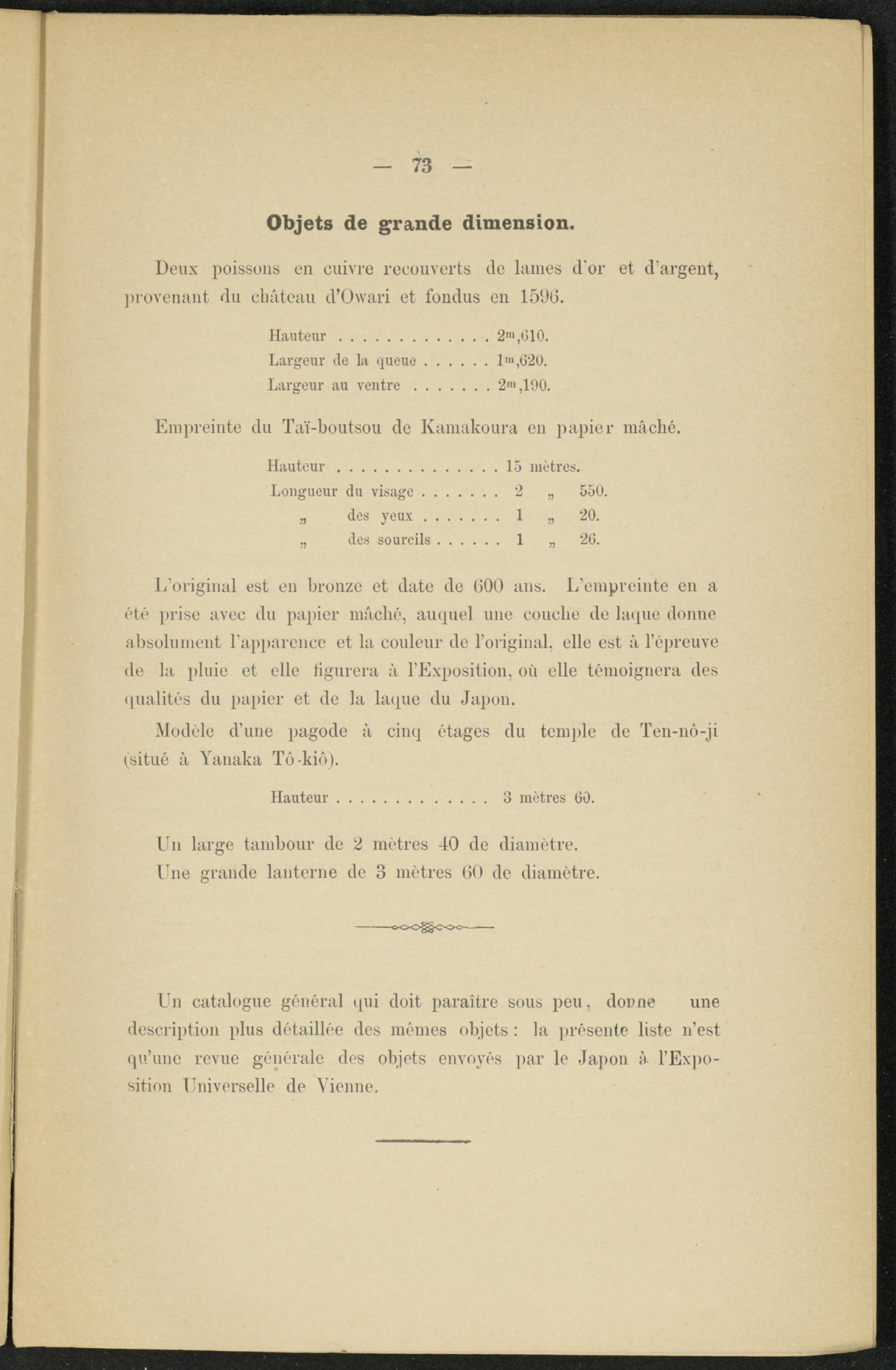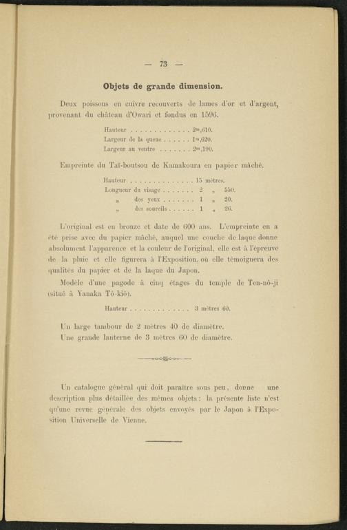 Un catalogue général qui doit paraître sous peu, donne une description plus détaillée des mêmes objets : la présente liste n’est qu’une revue générale des objets envoyés par le Japon à l’Exposition Universelle de Vienne.