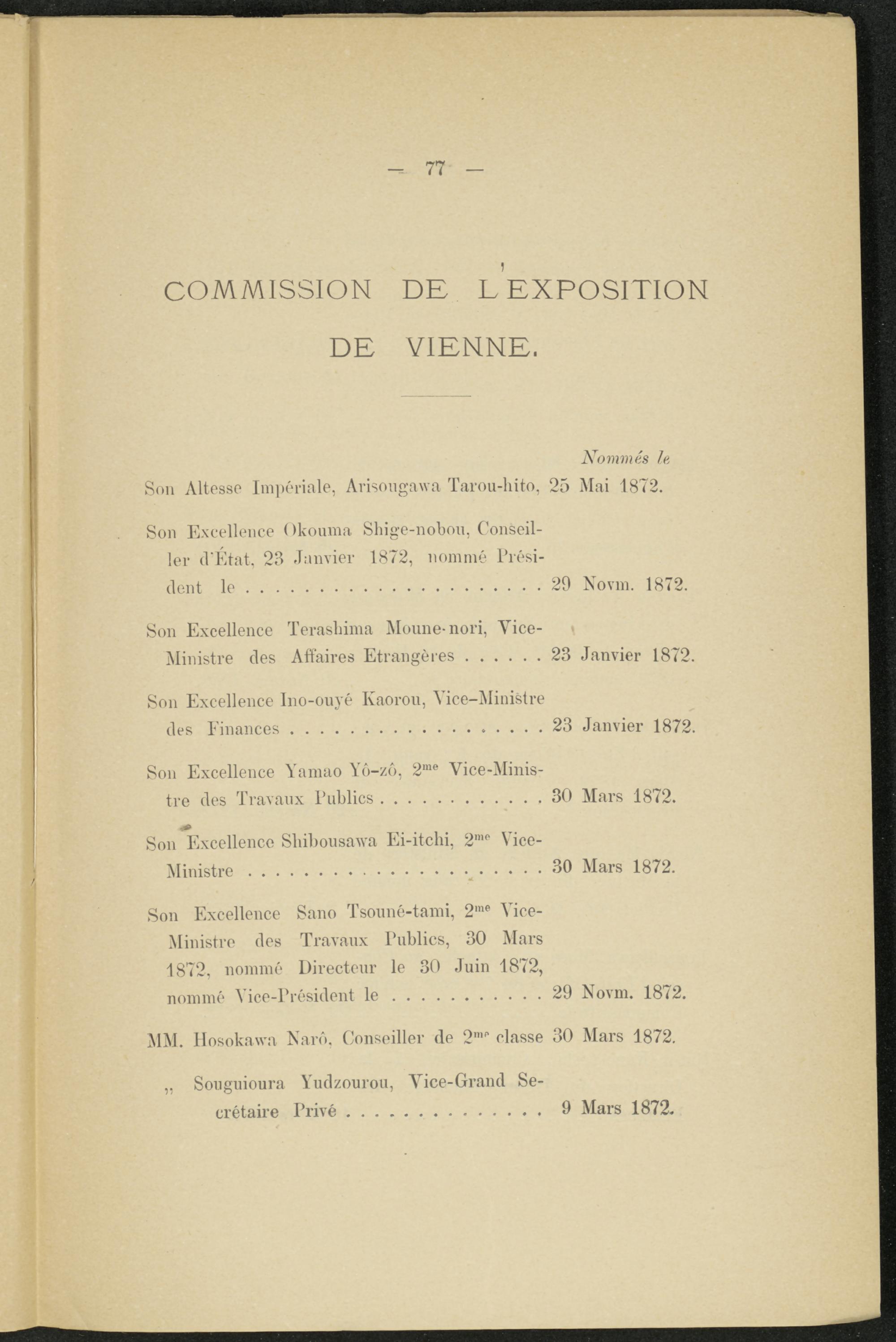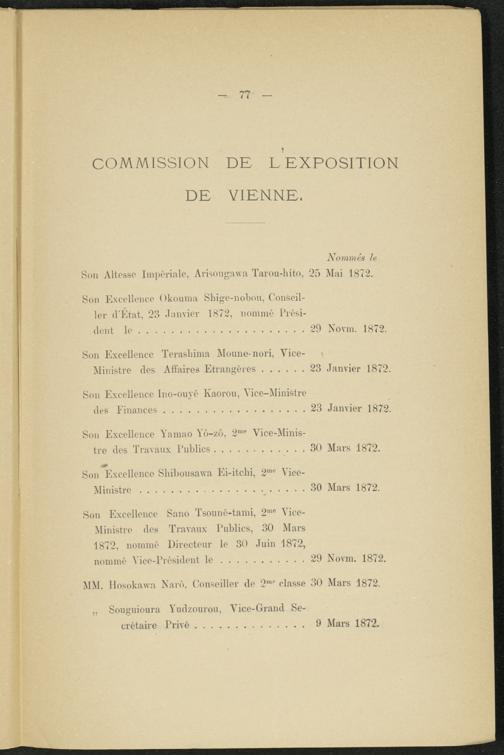 Son Excellence Sano Tsouné-tami, 2 ,ne Vice- Ministre des Travaux Publics, 30 Mars 1872, nommé Directeur le 30 Juin 1872, nommé Vice-Président le.29 Novm. 1872.