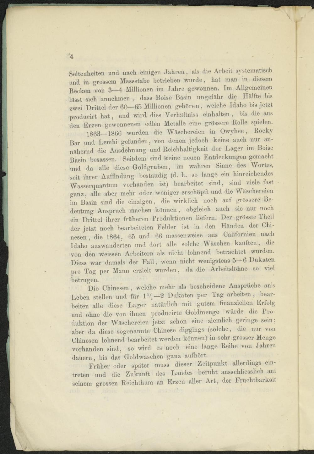 1863—1866 wurden die Wäschereien in Owvhee, Rocky Bar und Lemhi gefunden, von denen jedoch keine auch nur annähernd die Ausdehnung und Reichhaltigkeit der Lager im Boise Basin besassen. Seitdem sind keine neuen Entdeckungen gemacht und da alle diese Goldgruben, im wahren Sinne des Wortes, seit ihrer Auffindung bestäudig (d. li. so lange ein hinreichendes Wasserquantum vorhanden ist) bearbeitet sind, sind viele fast ganz, alle aber mehr oder weniger erschöpft und die Wäschereien im Basin sind die einzigen, die wirklich noch auf grössere Bedeutung Anspruch machen können, obgleich auch sie nur noch ein Drittel ihrer früheren Produktionen liefern. Der grösste Theil der jetzt noch bearbeiteten Felder ist in den Händen der Chinesen , die 1864, 65 und 66 massenweise aus Californien nach Idaho auswanderten und dort alle solche Wäschen kauften, die von den weissen Arbeitern als nicht lohnend betrachtet wurden. Diess war damals der Fall, wenn nicht wenigstens 5— 6 Dukaten pro Tag per Mann erzielt wurden, da die Arbeitslöhne so viel betrugen.