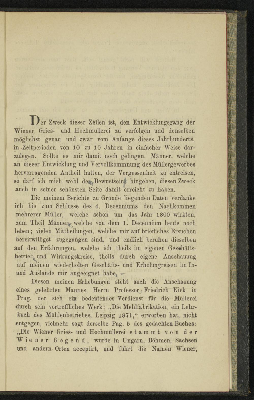 Diesen meinen Erhebungen steht auch die Anschauung eines gelehrten Mannes, Herrn Professor Friedrich Kick in Prag, der sich ein bedeutendes Verdienst für die Müllerei durch sein vortreffliches Werk: „Die Mehlfabrikation, ein Lehrbuch des Mühlenbetriebes, Leipzig 1871,“ erworben hat, nicht entgegen, vielmehr sagt derselbe Pag. 5 des gedachten Buches: „Die Wiener Gries- und Hochmüllerei stammt von der Wiener Gegend, wurde in Ungarn, Böhmen, Sachsen und andern Orten acceptirt, und führt die Namen Wiener,