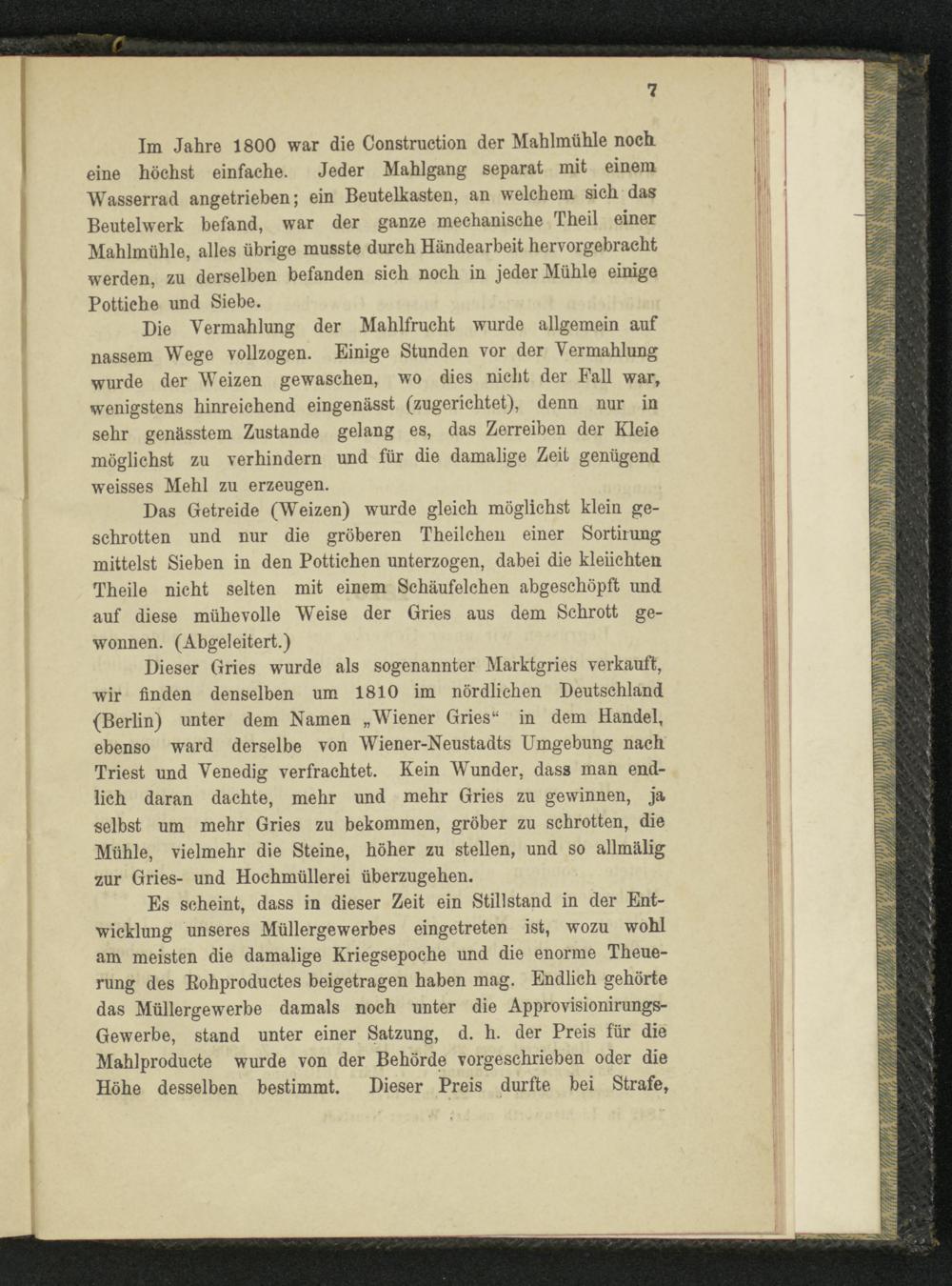 Dieser Gries wurde als sogenannter Marktgries verkauft, wir finden denselben um 1810 im nördlichen Deutschland (Berlin) unter dem Namen „Wiener Gries“ in dem Handel, ebenso ward derselbe von Wiener-Neustadts Umgebung nach Triest und Venedig verfrachtet. Kein Wunder, dass man endlich daran dachte, mehr und mehr Gries zu gewinnen, ja selbst um mehr Gries zu bekommen, gröber zu schrotten, die Mühle, vielmehr die Steine, höher zu stellen, und so allmälig zur Gries- und Hochmüllerei überzugehen.