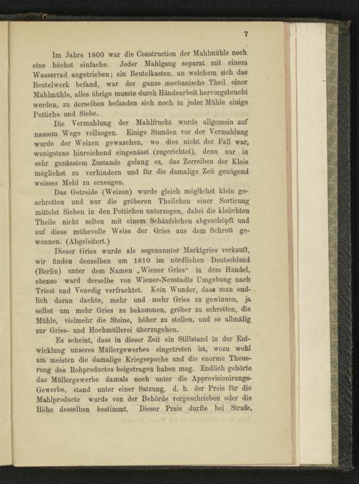 Im Jahre 1800 war die Construction der Mahlmühle noch, eine höchst einfache. Jeder Mahlgang separat mit einem Wasserrad angetrieben; ein Beutelkasten, an welchem sich das Beutelwerk befand, war der ganze mechanische Theil einer Mahlmühle, alles übrige musste durch Händearbeit hervorgebraeht werden, zu derselben befanden sieh noch in jeder Mühle einige Pottiche und Siebe.