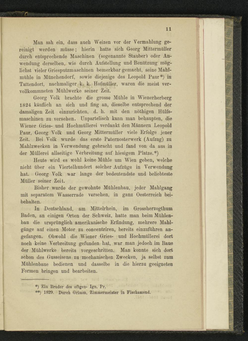 Man sah ein, dass auch Weizen vor der Vermahlung gereinigt werden müsse; hierin hatte sich Georg Mittermüller durch entsprechende Maschinen (sogenannte Stäuber) oder Anwendung derselben, wie durch Aufstellung und Benützung möglichst vieler Griesputzmaschinen bemerkbar gemacht, seine Mahlmühle in Münchendorf, sowie diejenige des Leopold Paur* **) ) in Tattendorf, nachmaliger k. k. Hofmüller, waren die meist ver- vollkommneten Mühlwerke seiner Zeit.