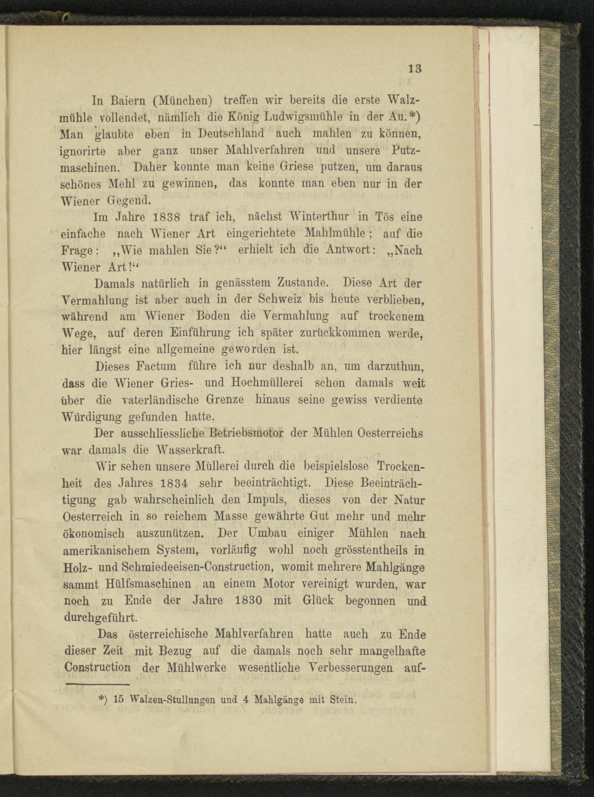 Im Jahre 1838 traf ich, nächst Winterthur in Tös eine einfache nach Wiener Art eingerichtete Mahlmühle; auf die Frage: „Wie mahlen Sie?“ erhielt ich die Antwort: „Nach Wiener Art!“