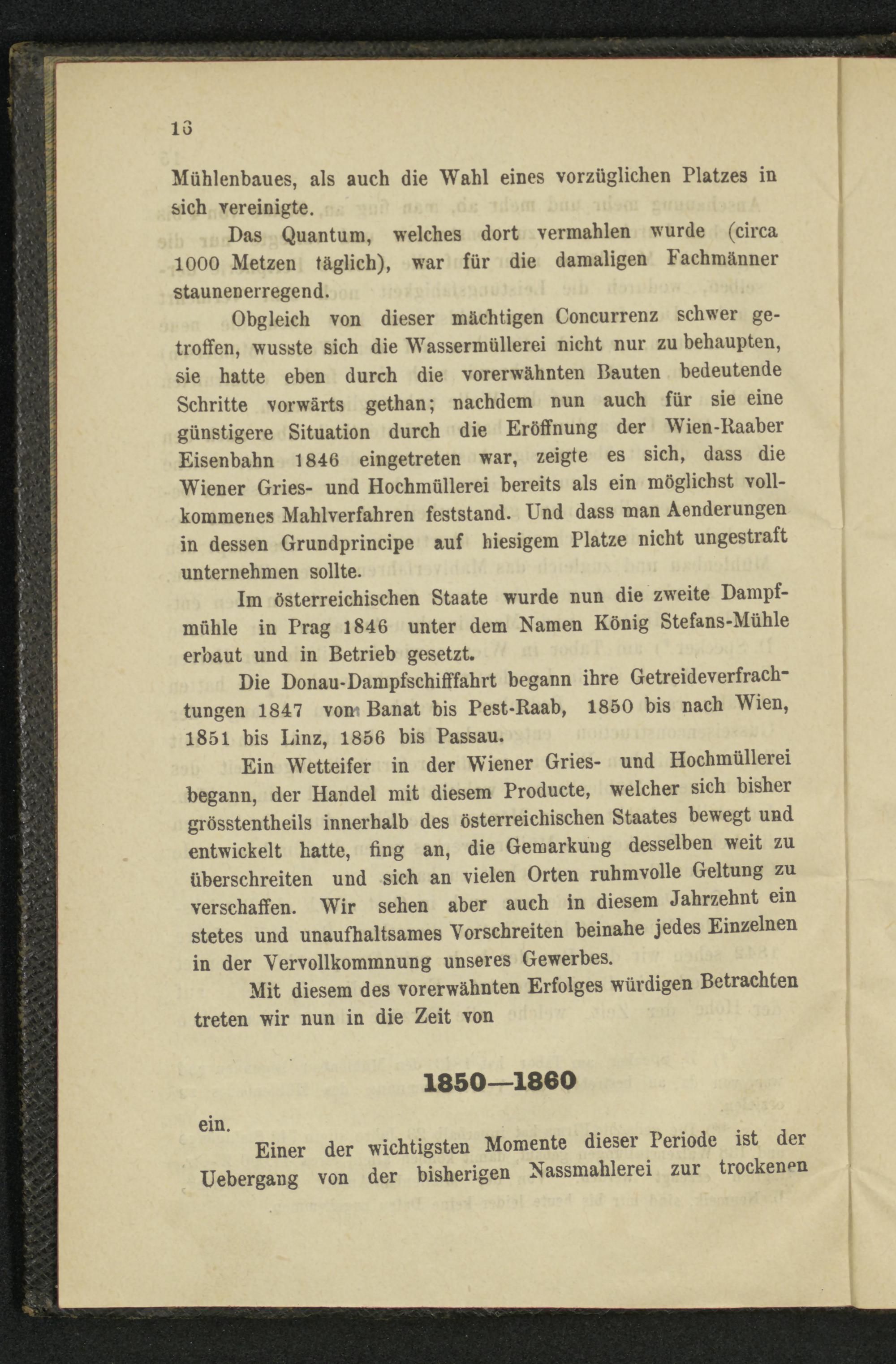 Obgleich von dieser mächtigen Concurrenz schwer getroffen, wusste sich die Wassermüllerei nicht nur zu behaupten, sie hatte eben durch die vorerwähnten Bauten bedeutende Schritte vorwärts gethan; nachdem nun auch für sie eine günstigere Situation durch die Eröffnung der Wien-Raaber Eisenbahn 1846 eingetreten war, zeigte es sich, dass die Wiener Gries- und Hochmüllerei bereits als ein möglichst vollkommenes Mahlverfahren feststand. Und dass man Aenderungen in dessen Grundprincipe auf hiesigem Platze nicht ungestraft unternehmen sollte.