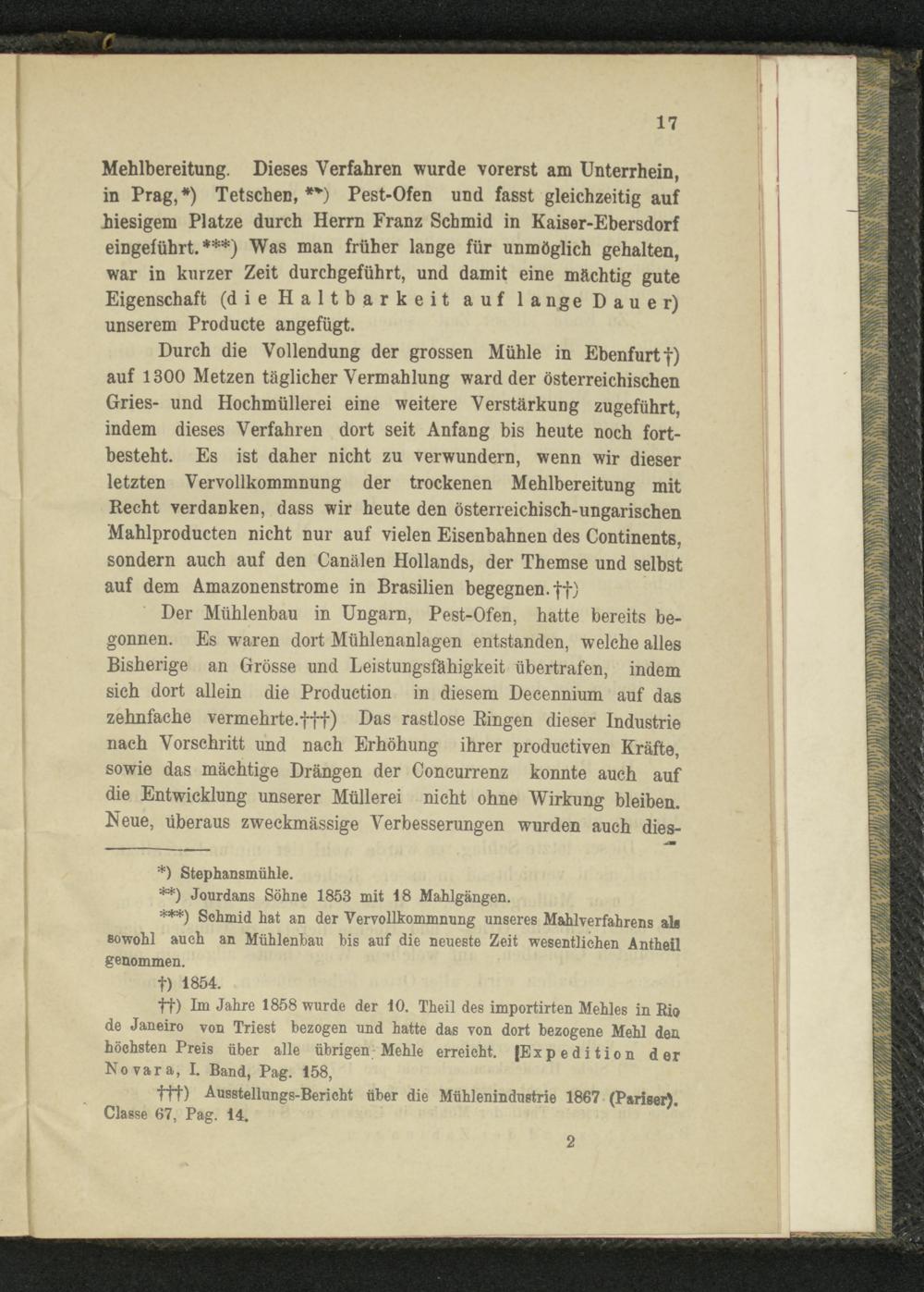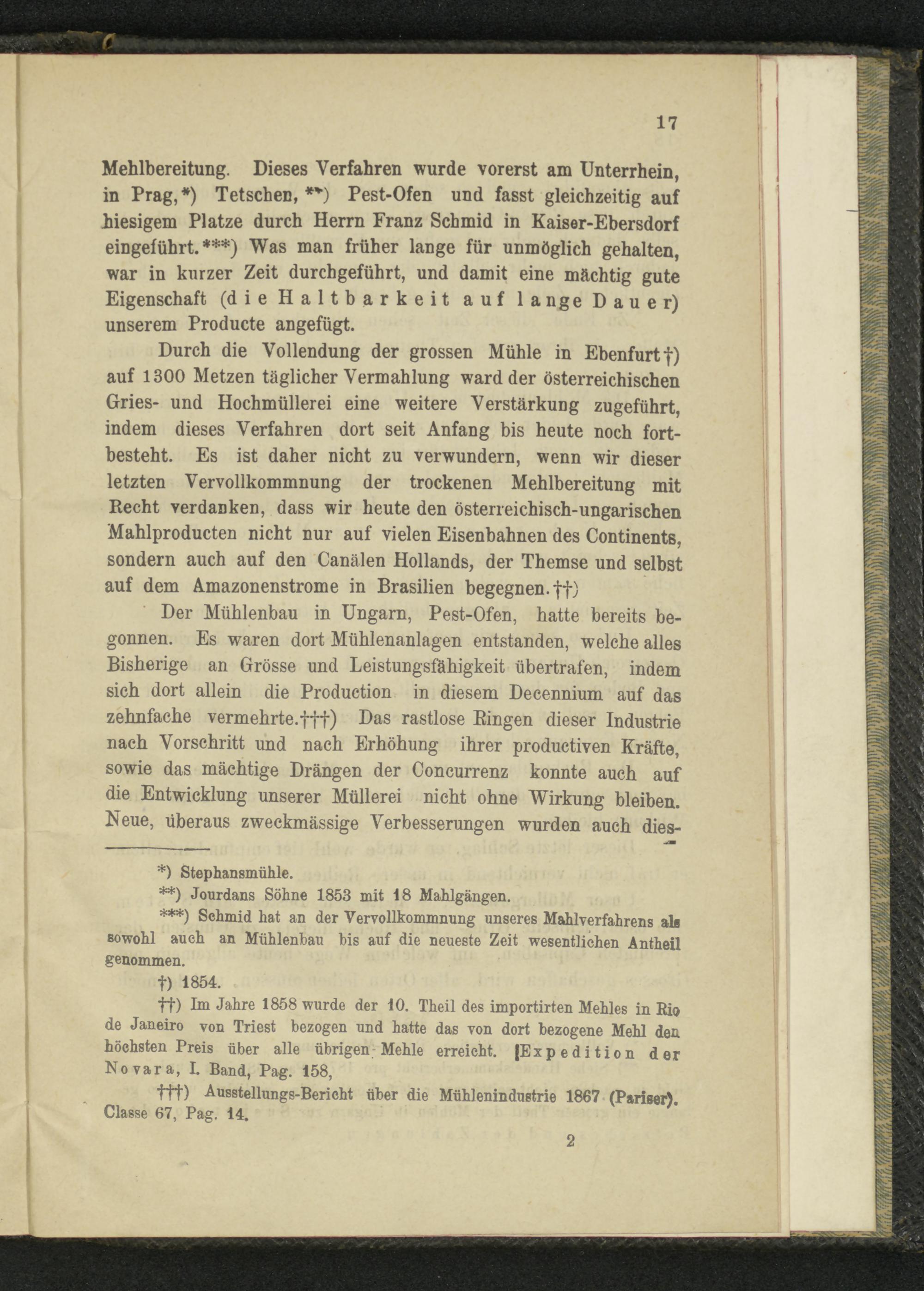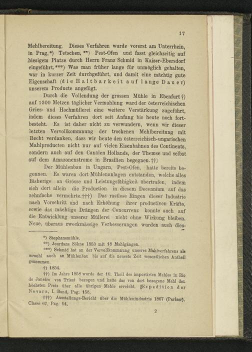 Mehlbereitung. Dieses Verfahren wurde vorerst am Unterrhein, in Prag,*) Tetschen, **) Pest-Ofen und fasst gleichzeitig auf hiesigem Platze durch Herrn Franz Schmid in Kaiser-Ebersdorf eingeführt.***) Was man früher lange für unmöglich gehalten, war in kurzer Zeit durchgeführt, und damit eine mächtig gute Eigenschaft (die Haltbarkeit auflange Dauer) unserem Producte angefügt.