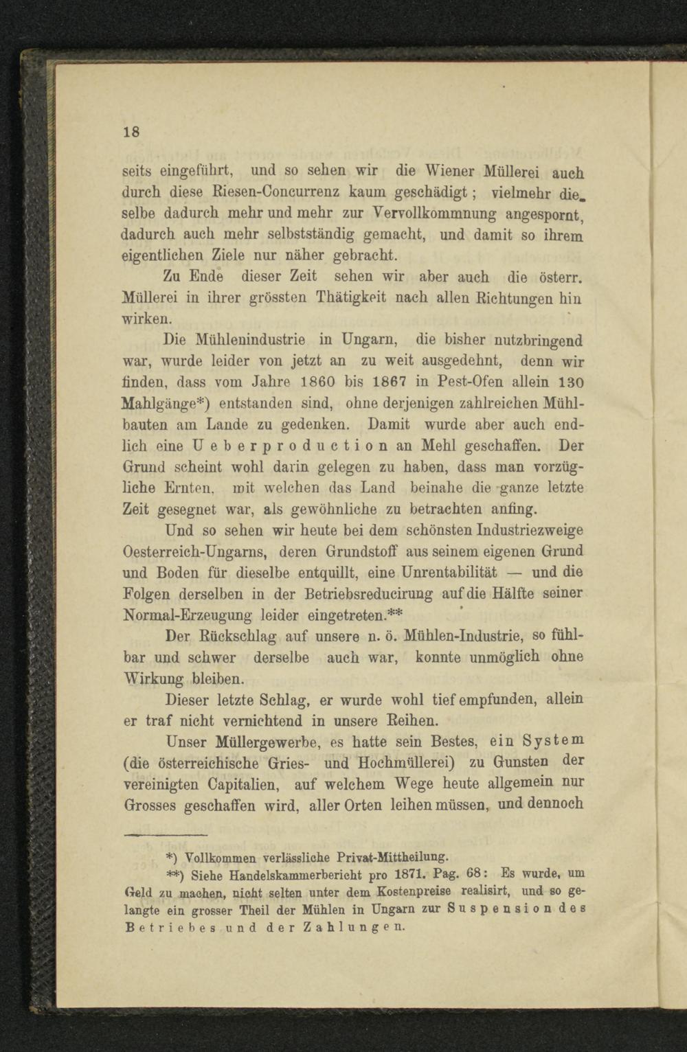 **) Siehe Handelskammerbericht pro 1871. Pag. 68: Es wurde, um Geld zu machen, nicht selten unter dem Kostenpreise realisirt, und so gelangte ein grosser Theil der Mühlen in Ungarn zur Suspension des Betriebes und der Zahlungen.