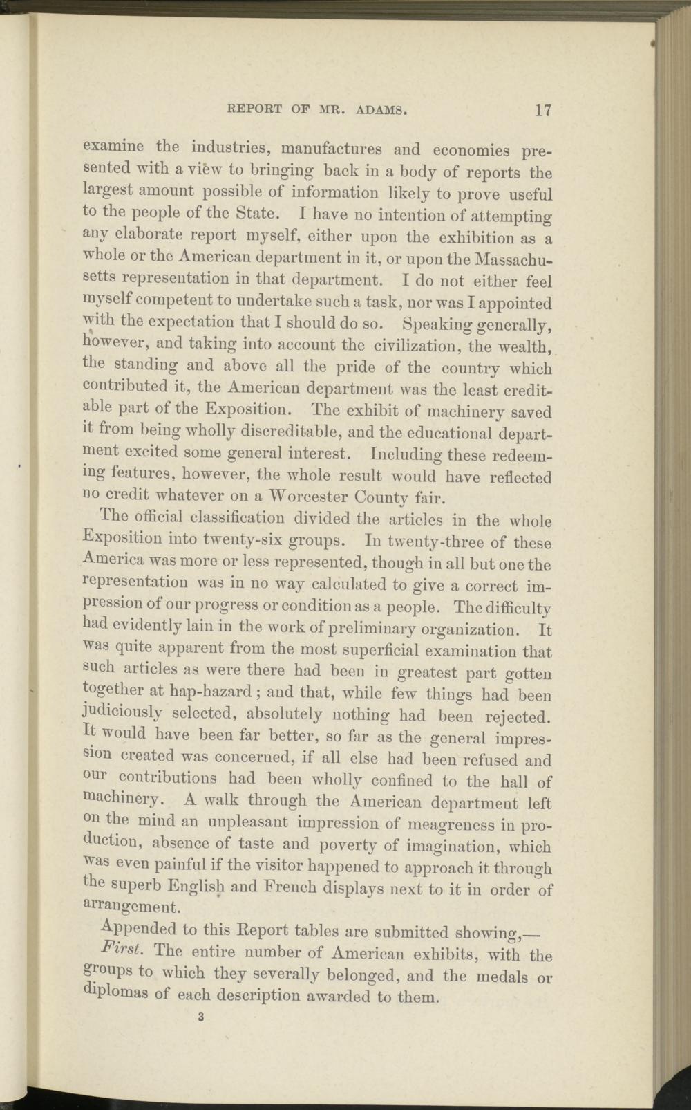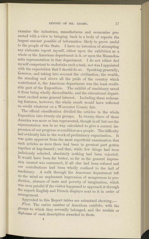 examine the industries, manufactures and economies presented with a vi&w to bringing back in a body of reports the largest amount possible of information likely to prove useful to the people of the State. I have no intention of attempting any elaborate report myself, either upon the exhibition as a whole or the American department in it, or upon the Massachusetts representation in that department. I do not either feel myself competent to undertake such a task, nor was I appointed with the expectation that I should do so. Speaking generally, however, and taking into account the civilization, the wealth, the standing and above all the pride of the country which contributed it, the American department was the least creditable part of the Exposition. The exhibit of machinery saved it from being wholly discreditable, and the educational department excited some general interest. Including these redeeming features, however, the whole result would have reflected no credit whatever on a Worcester County fair.