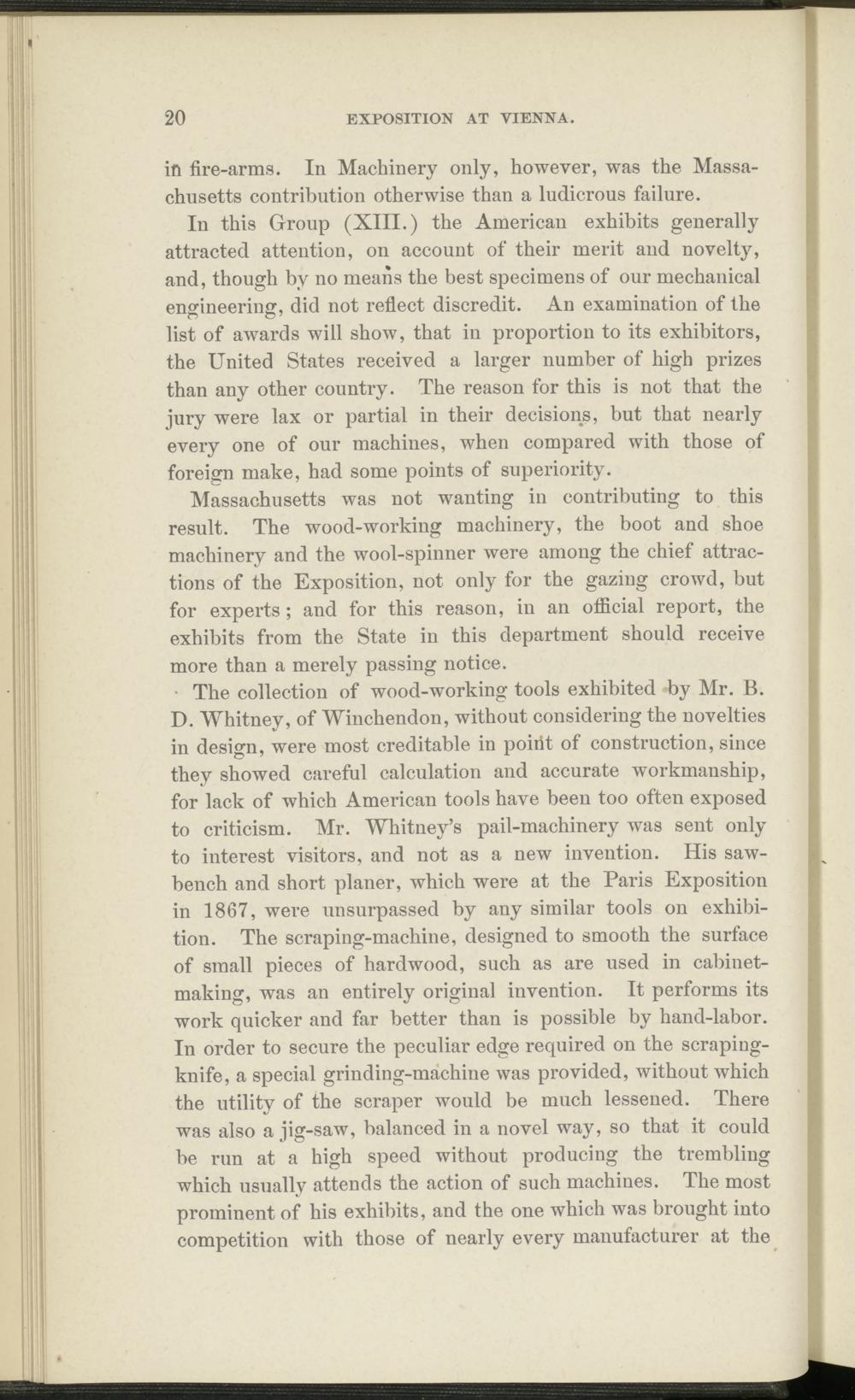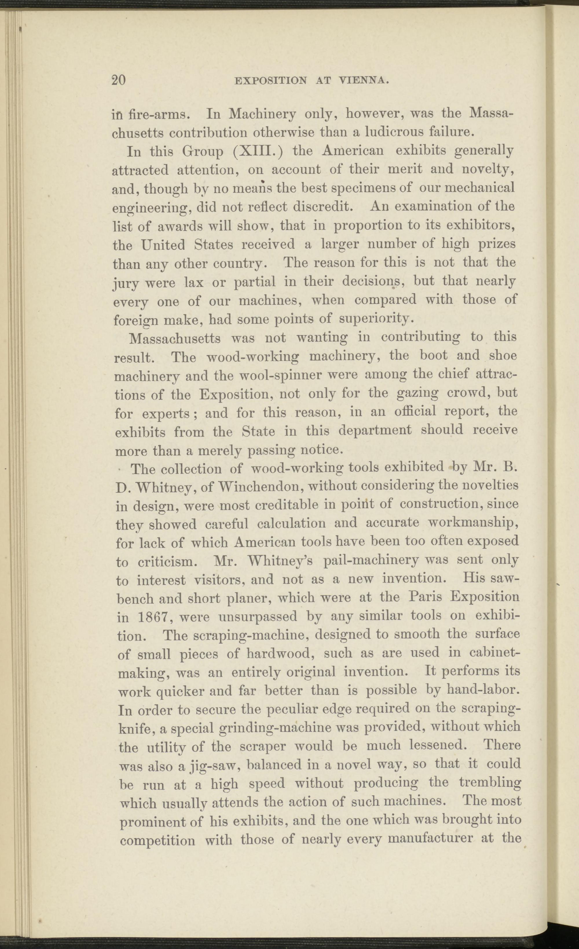 Massachusetts was not wanting in contributing to this result. The wood-working machinery, the boot and shoe machinery and the wool-spinner were among the chief attractions of the Exposition, not only for the gazing crowd, but for experts ; and for this reason, in an official report, the exhibits from the State in this department should receive more than a merely passing notice.