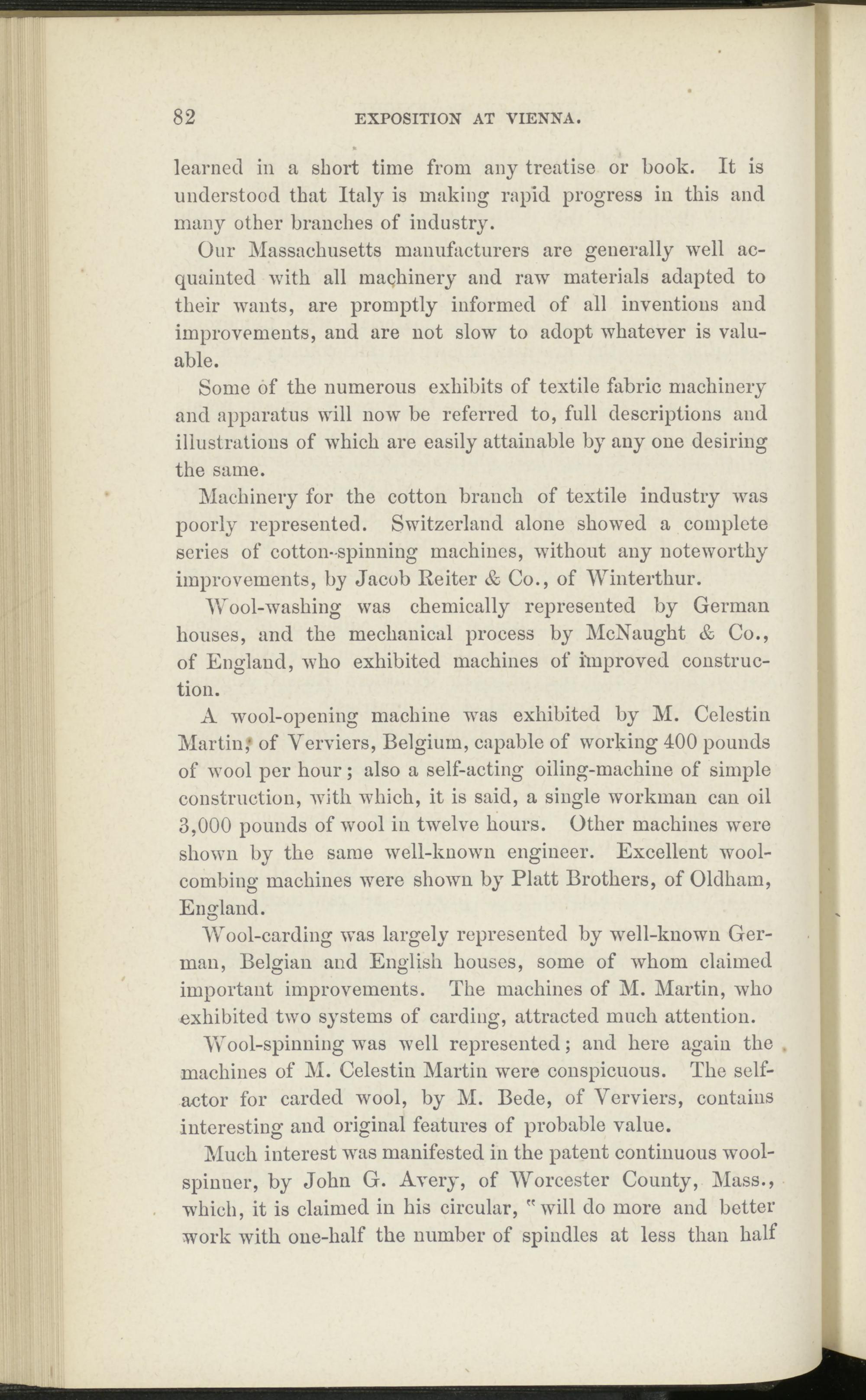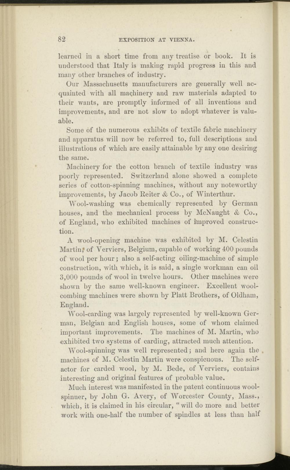 Wool-carding w T as largely represented by well-known German, Belgian and English houses, some of whom claimed important improvements. The machines of M. Martin, who exhibited two systems of carding, attracted much attention.