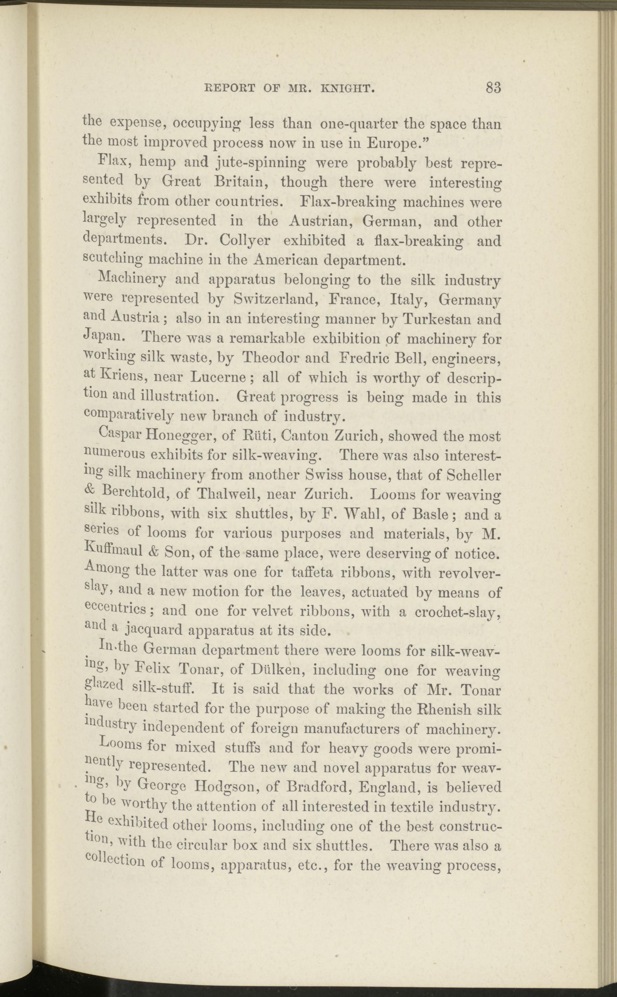 Machinery and apparatus belonging to the silk industry were represented by Switzerland, France, Italy, Germany and Austria; also in an interesting manner by Turkestan and Japan. There was a remarkable exhibition of machinery for working silk waste, by Theodor and Fredric Bell, engineers, at Kriens, near Lucerne; all of which is worthy of description and illustration. Great progress is being made in this comparatively new branch of industry.