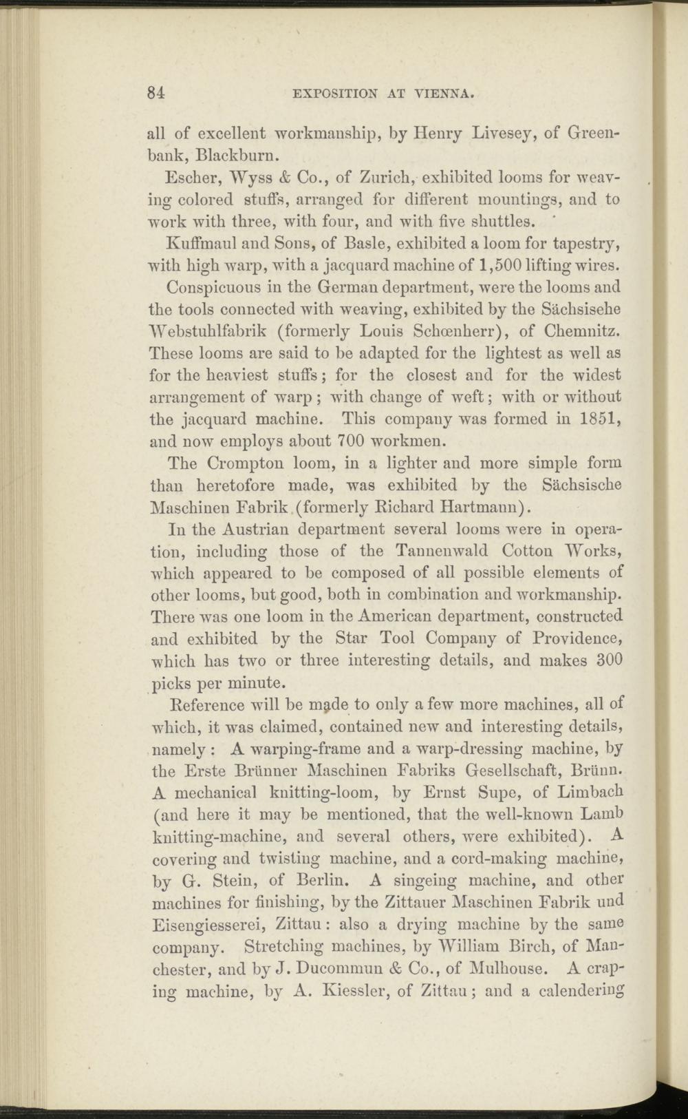 Conspicuous in the German department, were the looms and the tools connected with weaving, exhibited by the Sachsisehe Webstuhlfabrik (formerly Louis Schoenherr), of Chemnitz. These looms are said to be adapted for the lightest as well as for the heaviest stuffs; for the closest and for the widest arrangement of warp ; with change of weft; with or without the jacquard machine. This company was formed in 1851, and now employs about 700 workmen.