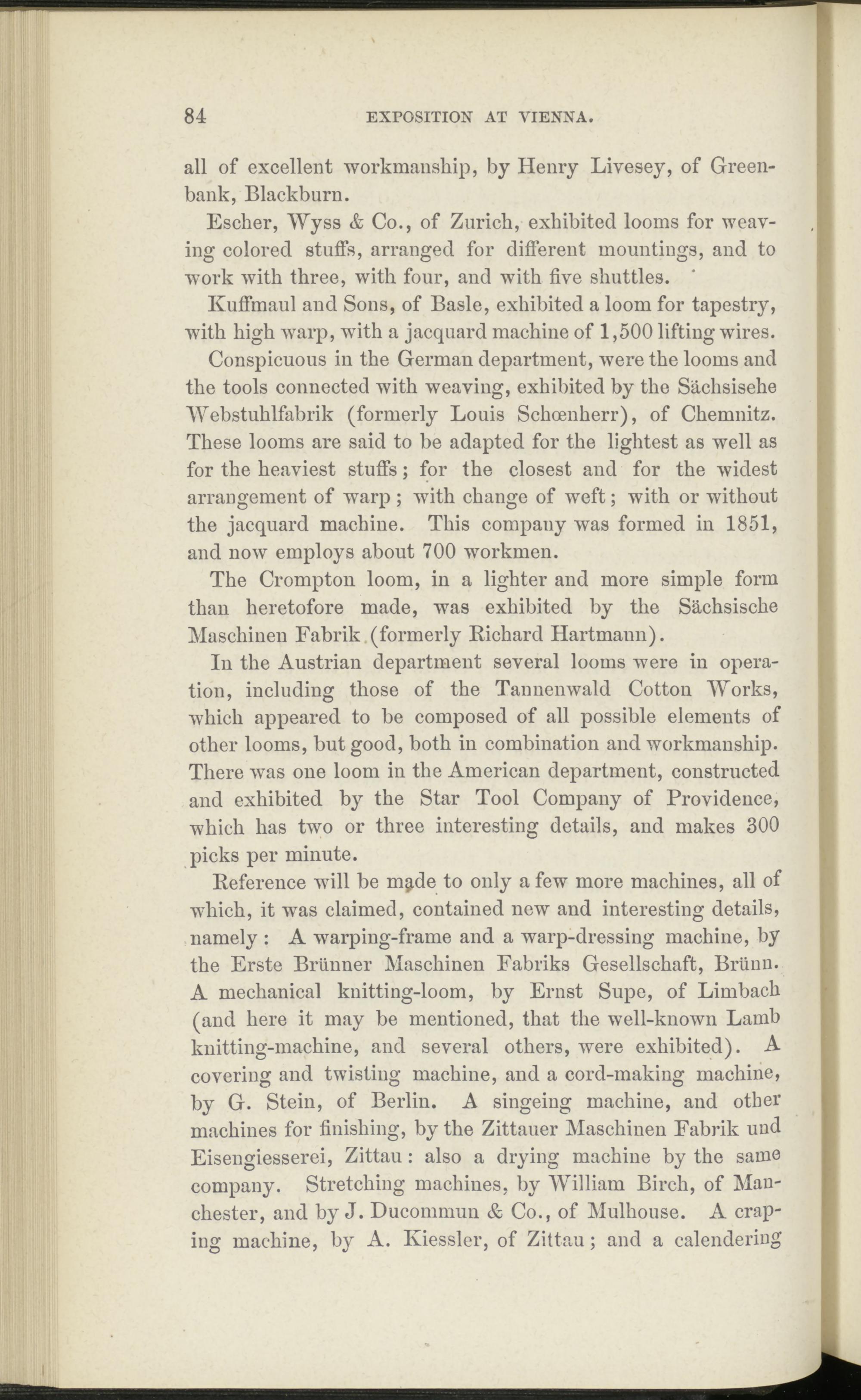 In the Austrian department several looms were in operation, including those of the Tannenwald Cotton Works, which appeared to be composed of all possible elements of other looms, but good, both in combination and workmanship. There was one loom in the American department, constructed and exhibited by the Star Tool Company of Providence, which has two or three interesting details, and makes 300 picks per minute.