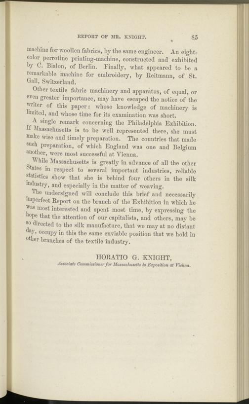 The undersigned will conclude this brief and necessarily imperfect Report on the branch of the Exhibition in which he ^as most interested and spent most time, by expressing the tope that the attention of our capitalists, and others, may be so directed to the silk manufacture, that we may at no distant day 5 occupy in this the same enviable position that we hold in other branches of the textile industry.