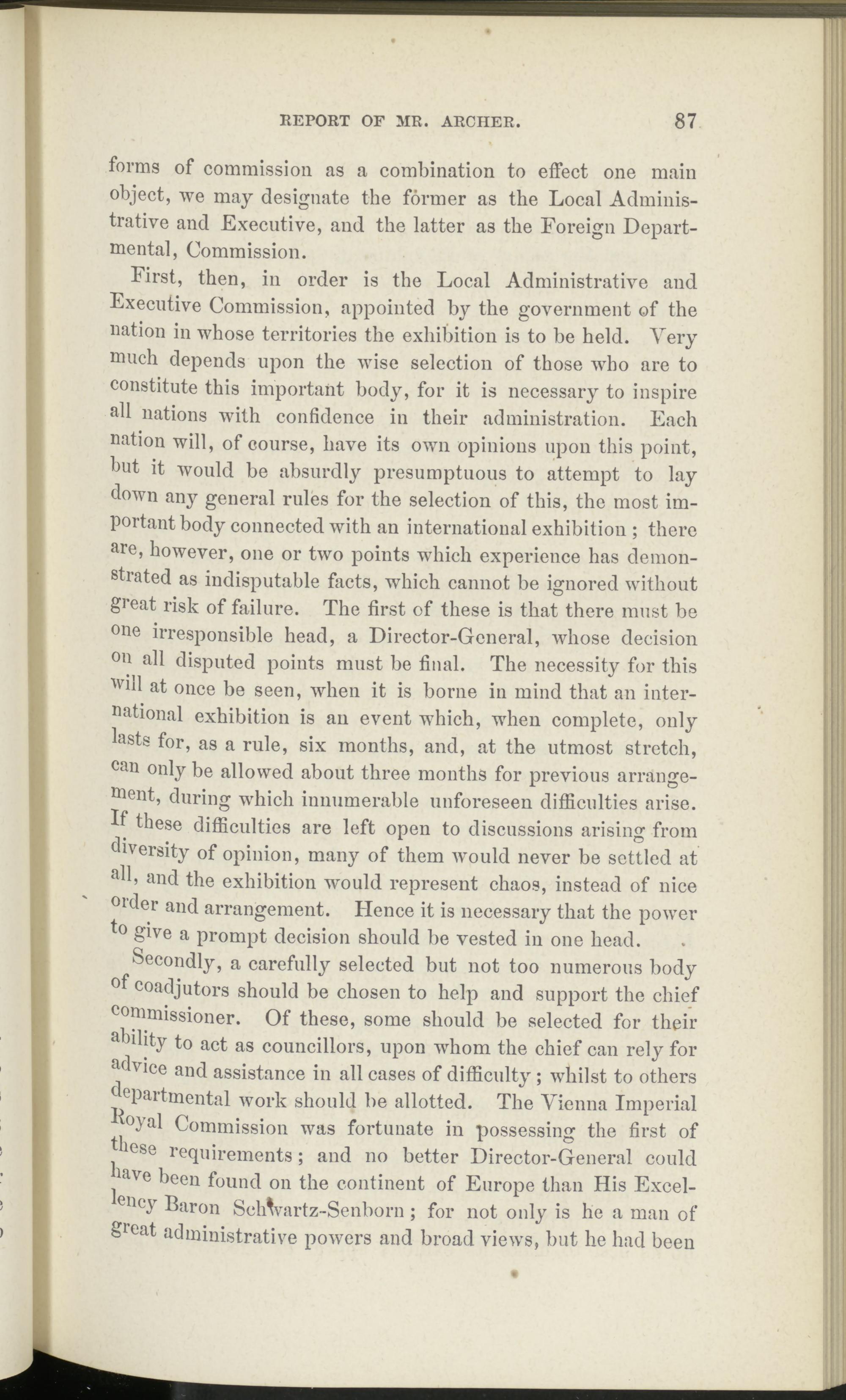 Secondly, a carefully selected but not too numerous body of coadjutors should be chosen to help and support the chief commissioner. Of these, some should be selected for their ability to act as councillors, upon whom the chief can rely for advice and assistance in all cases of difficulty ; whilst to others departmental work should be allotted. The Vienna Imperial Eoyal Commission was fortunate in possessing the first of these requirements ; and no better Director-General could have been found on the continent of Europe than His Excellency Baron Sch^vartz-Senborn ; for not only is he a man of great administrative powers and broad views, but he had been