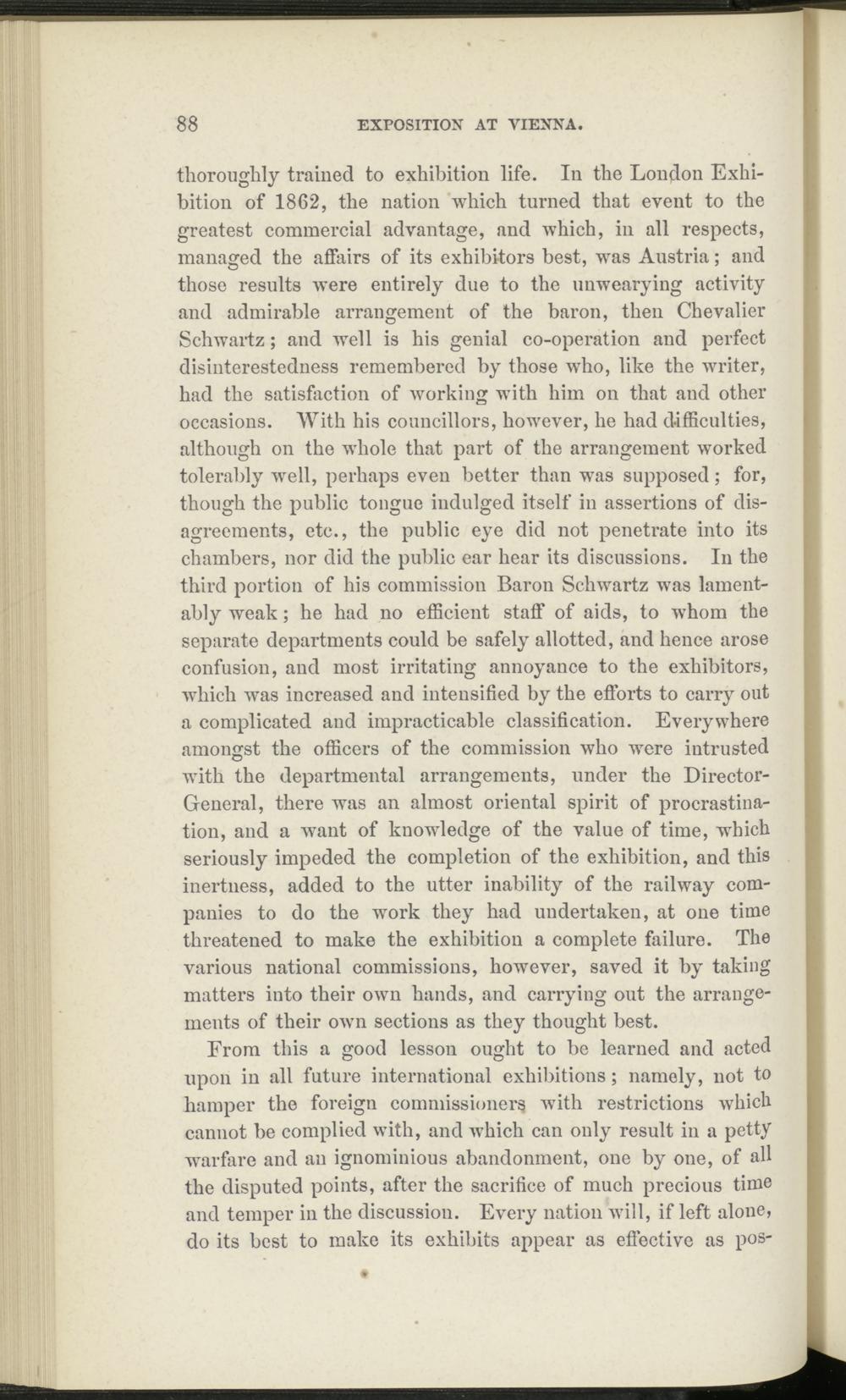thoroughly trained to exhibition life. In the London Exhibition of 1862 , the nation which turned that event to the greatest commercial advantage, and which, in all respects, managed the affairs of its exhibitors best, was Austria; and those results were entirely due to the unwearying activity and admirable arrangement of the baron, then Chevalier Schwartz; and well is his genial co-operation and perfect disinterestedness remembered by those who, like the writer, had the satisfaction of working with him on that and other occasions. With his councillors, however, he had difficulties, although on the whole that part of the arrangement worked tolerably well, perhaps even better than was supposed; for, though the public tongue indulged itself in assertions of disagreements, etc., the public eye did not penetrate into its chambers, nor did the public ear hear its discussions. In the third portion of his commission Baron Schwartz was lamentably weak; he had no efficient staff of aids, to whom the separate departments could be safely allotted, and hence arose confusion, and most irritating annoyance to the exhibitors, which was increased and intensified by the efforts to carry out a complicated and impracticable classification. Everywhere amongst the officers of the commission who were intrusted with the departmental arrangements, under the Director- General, there was an almost oriental spirit of procrastination, and a want of knowledge of the value of time, which seriously impeded the completion of the exhibition, and this inertness, added to the utter inability of the railway companies to do the work they had undertaken, at one time threatened to make the exhibition a complete failure. The various national commissions, however, saved it by taking matters into their own hands, and carrying out the arrangements of their own sections as they thought best.