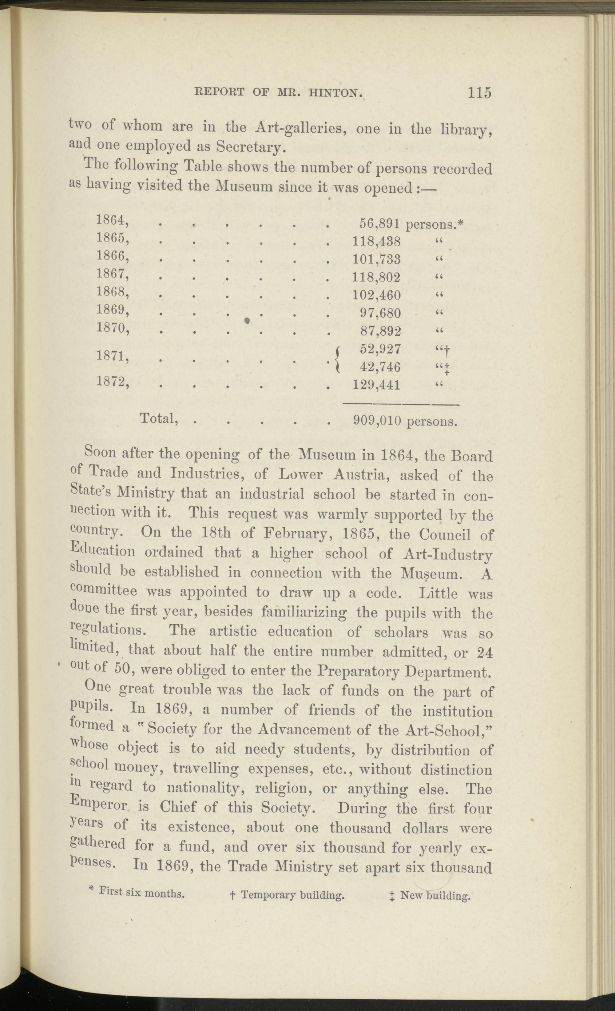 One great trouble was the lack of funds on the part of Pupils. In 1869, a number of friends of the institution formed a " Society for the Advancement of the Art-School,” 'whose object is to aid needy students, by distribution of school money, travelling expenses, etc., without distinction in regard to nationality, religion, or anything else. The Emperor is Chief of this Society. During the first four years of its existence, about one thousand dollars were gathered for a fund, and over six thousand for yearly expenses. In 1869, the Trade Ministry set apart six thousand